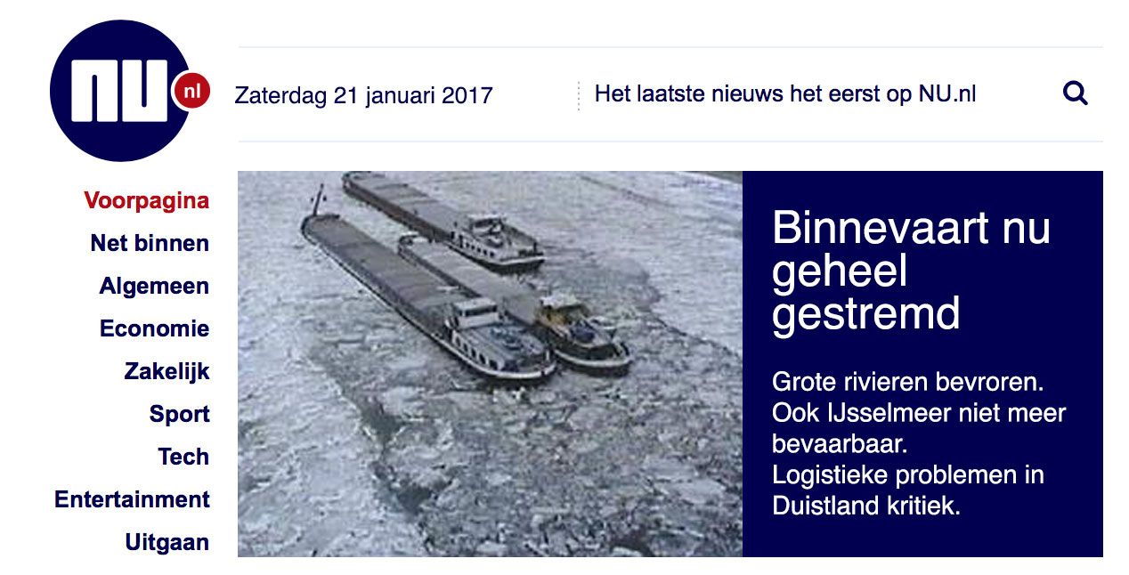 De Grote Rivieren zijn de afgelopen dagen min of meer dichtgevroren. Eerder zag ik al indrukwekkende foto’s uit Rotterdam met ijsschotsen op de Maas. Ik ben opgegroeid aan die Maas en kan me dat soort schotsen uit mijn jeugd niet herinneren. Het water was vroeger wel aanzienlijk vervuilder - en vooral zouter door de Kali-mijnen in Frankrijk, maar de zaak ligt nu zo goed als dicht; de schotsen botsen op elkaar en vormen binnen twee etmalen een plak ijs die bij Maassluis begint en helemaal tot in Basel doorloopt. De ijsgrens groeit in een etmaal voorbij Hoek van Holland de zee op en op de satellietfoto zie je een soort Derde Maasvlakte ontstaan in de Noordzee, waar het zoete water als ijsprut en later -korst de Noordzee in steekt.