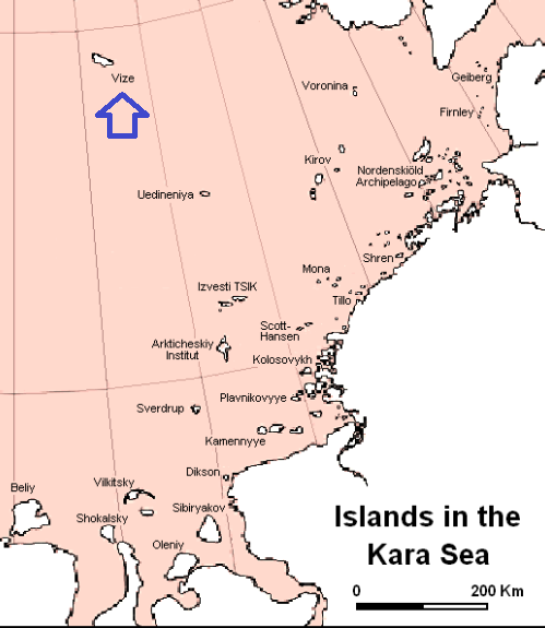 Onderstaande temperatuurgrafiek hoort bij het Arctisch meetstation eiland Vize in de Karazee (zie kaartje)