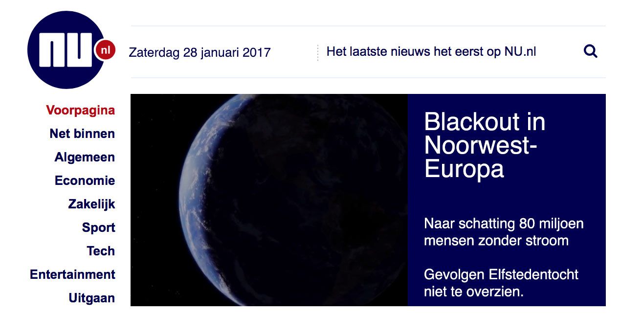 Maar niet alleen bij ons in het dorp ligt de stroom eruit: als ik Radio 1 aanzet is dát het nieuws, en niet de Elfstedentocht - of meer: de wedstrijd, want de tocht is pas over een paar dagen, nee: in heel noordwest-Europa is het licht uitgegaan en zowel de oorzaak als de gevolgen daarvan zijn nog onbekend. Wat we horen is: een overbelasting op het Duitse net heeft waarschijnlijk een kettingreactie veroorzaakt met deze gevolgen. De centrales die al het werk deden draaiden al op vol vermogen en er moest werkelijk niets raars gebeuren. De dichtgevroren haven van Hamburg zou de aanvoer van olie net genoeg verstoord hebben om deze kettingreactie in gang te zetten. Naar schatting 80 miljoen mensen zitten in de kou zonder stroom, internet, verwarming.