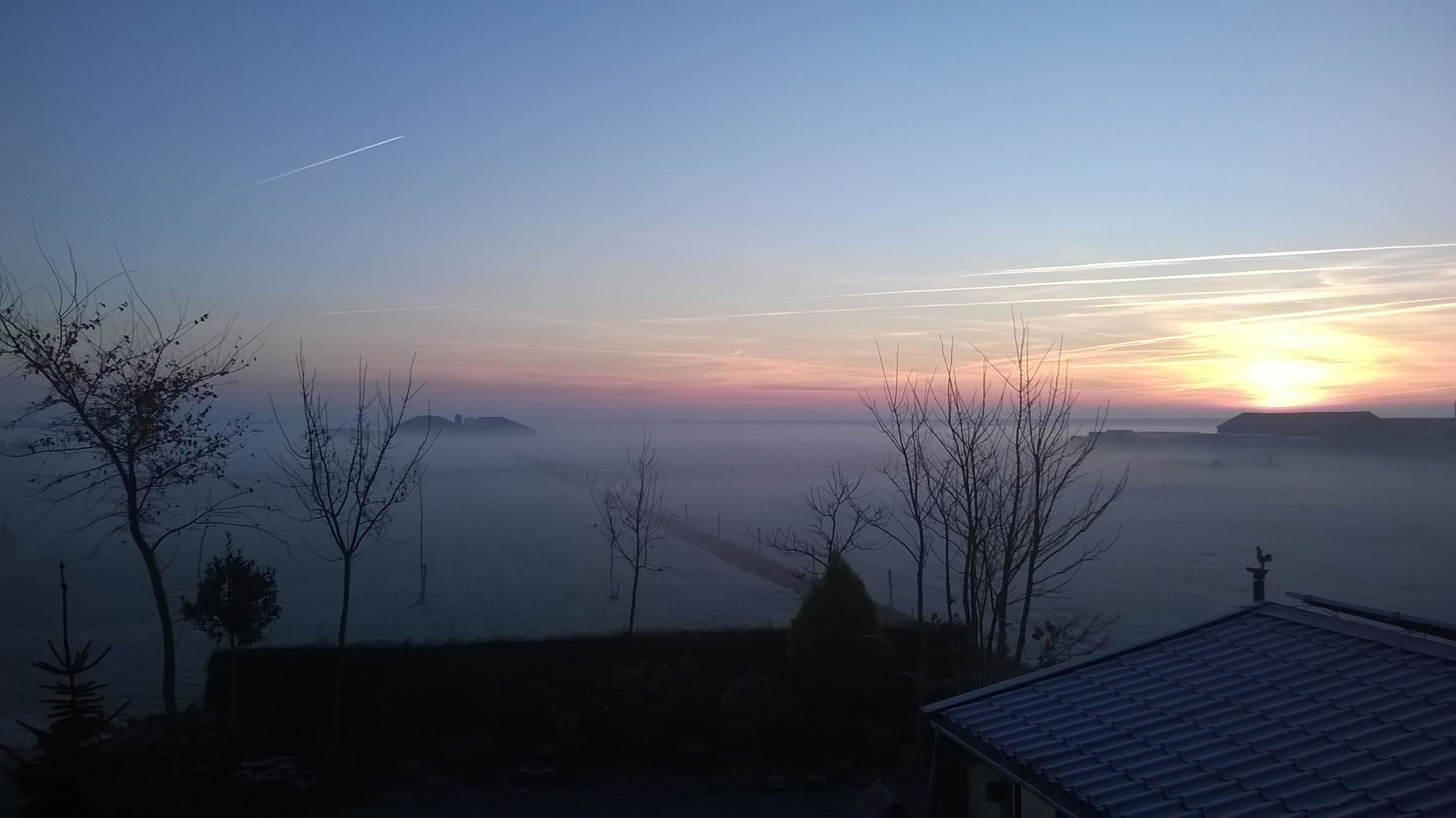 Het val mij op dat die lucht nu zo wit is met zonsopkomst.