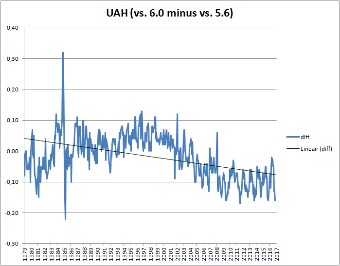 Dat komt door de wijziging in UAH van versie 5.6 naar 6.0, die ik tegelijk meeneem. Die reeks is daarbij enorm neerwaarts aangepast (trend van 0,15 naar 0,12°/10jr).