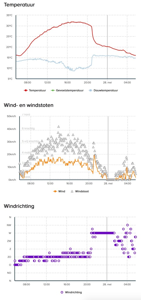 De temperatuur is nou niet echt noemenswaardig gedaalt met de doorkomst van de buien hier. De windsprong van ZO (temp: 29,6ºC) -> W (21,6ºC in 1 uur tijd) gisteravond maakt meer indruk.