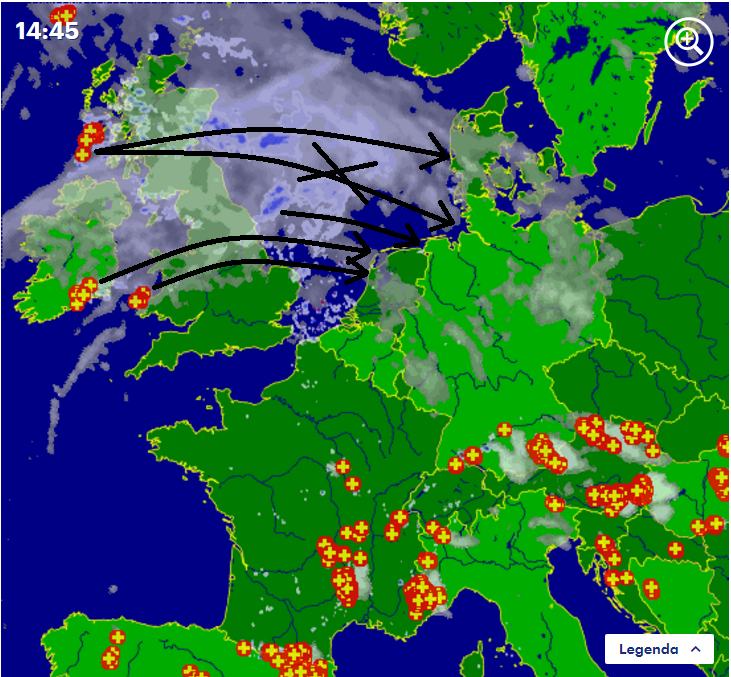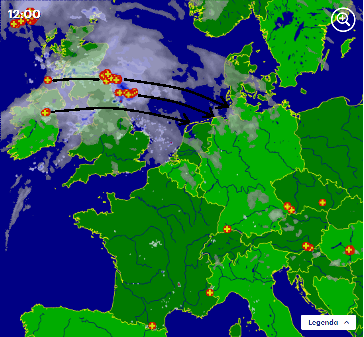 Die Vanavond en vanacht op de noordzee richting Noord Holland, de wadden, Friesland, Groningen, Duitsland en Denenmarken trekken