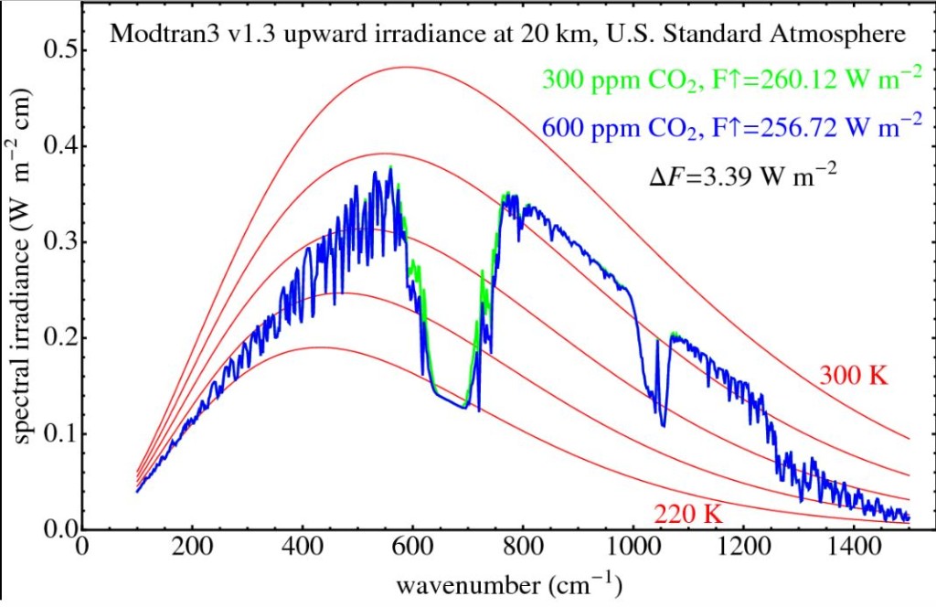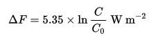 Het theoretische effect in W.m-2 is via de gegeven formule (geef ik in plaatje 2) ook bepaalbaar. Ik kom uit op 1,95 W.m-2 van 1800 tot dit jaar, op basis van de in mijn eerste bericht vermelde concentraties CO2.