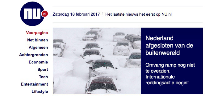 Op zondag 19 februari begint langzaam door te dringen wat de gevolgen zijn geweest van het noodweer van de afgelopen dagen. Dat is even schrikken. Want, hoewel het er buiten werkelijk schitterend uitziet en de mensen in de straat weer werktuigelijk maar opgelucht een pad over hun stoep proberen te scheppen (wat onbegonnen werk is) is het in Nederland goed mis.