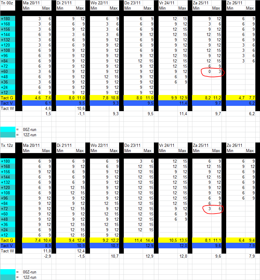 Onderstaand de verwachting voor de Tx en Tn in De Bilt op basis van alle 00z en 12z Opers voor de periode tot en met 29-11.