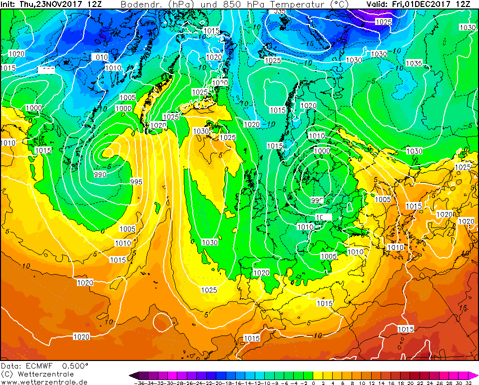 Ik zie toch nog echt geen winter op deze kaart. Hierbij de 850hPa temps, echte kou zit echt 2000 km naar het noordoosten. Potentie is er, maar de buit is nog lang niet binnen.