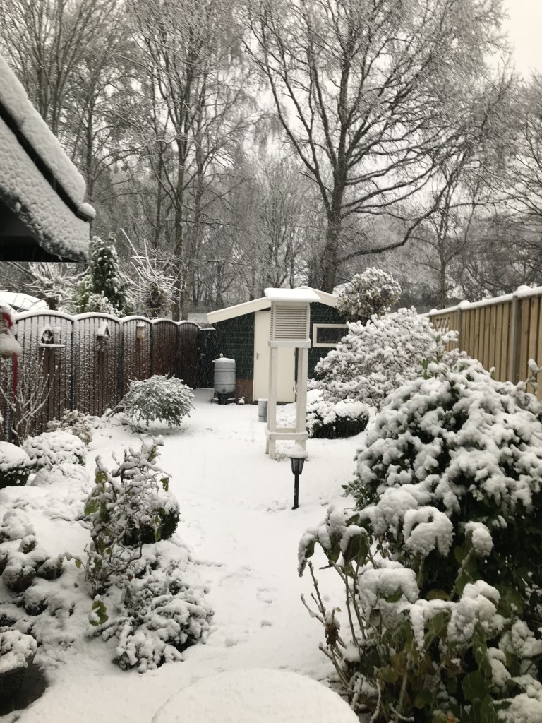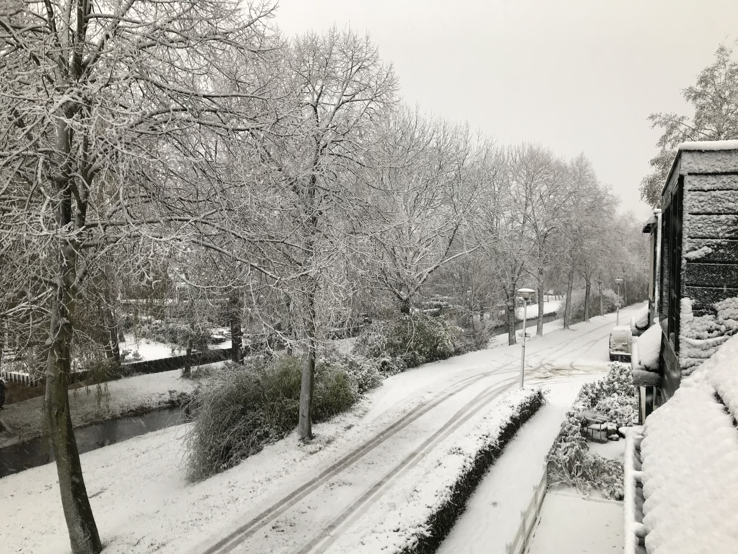 En opeens is het hier wit!. en nu door sneeuwen. Tact: 0.3°C.