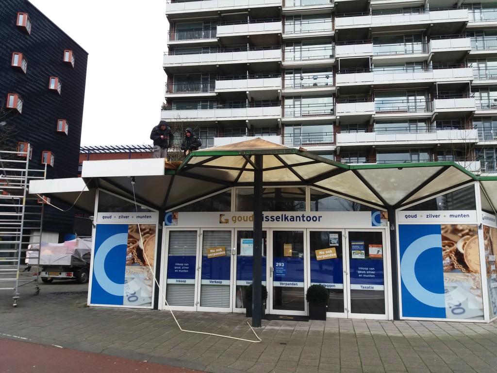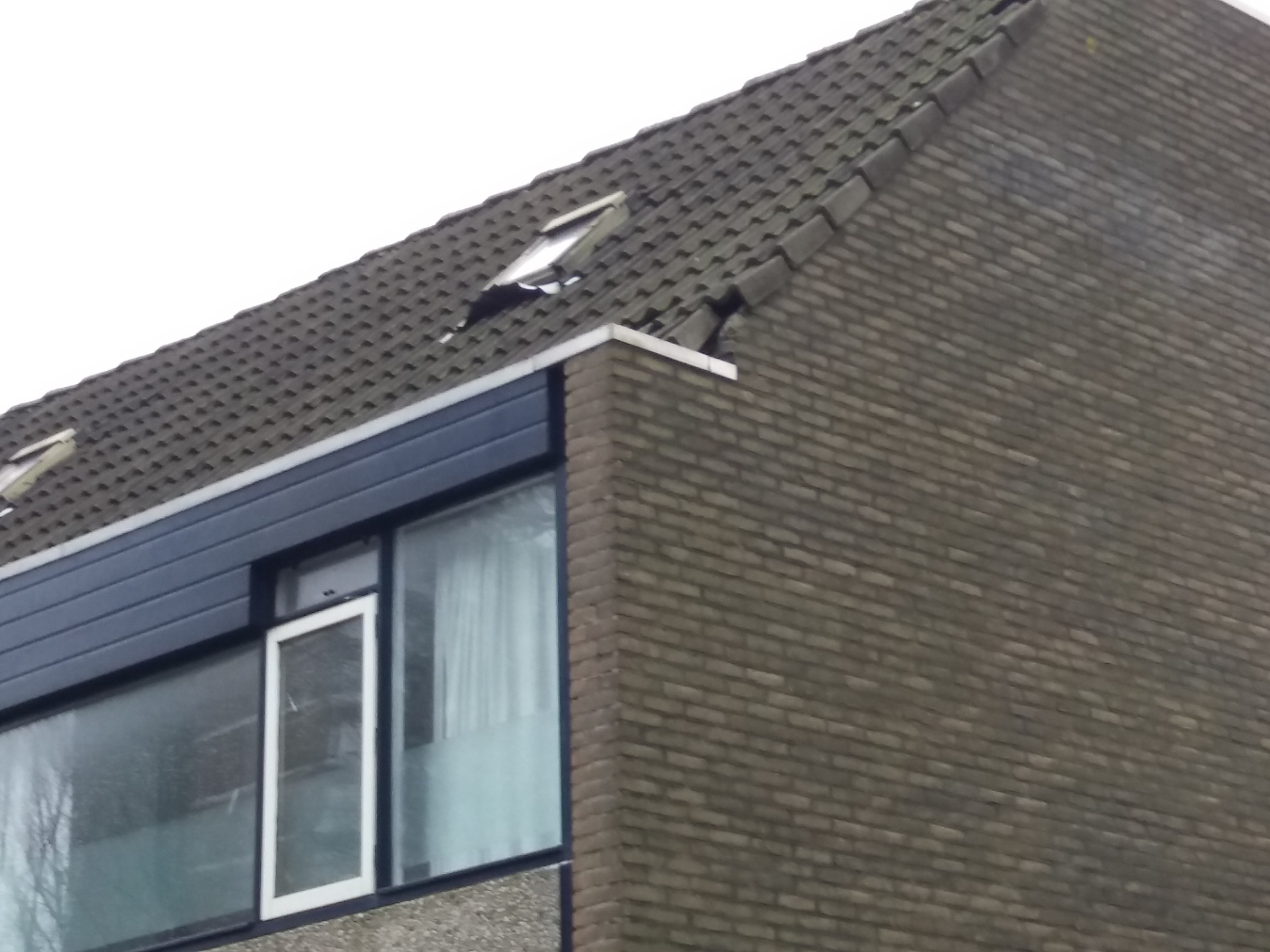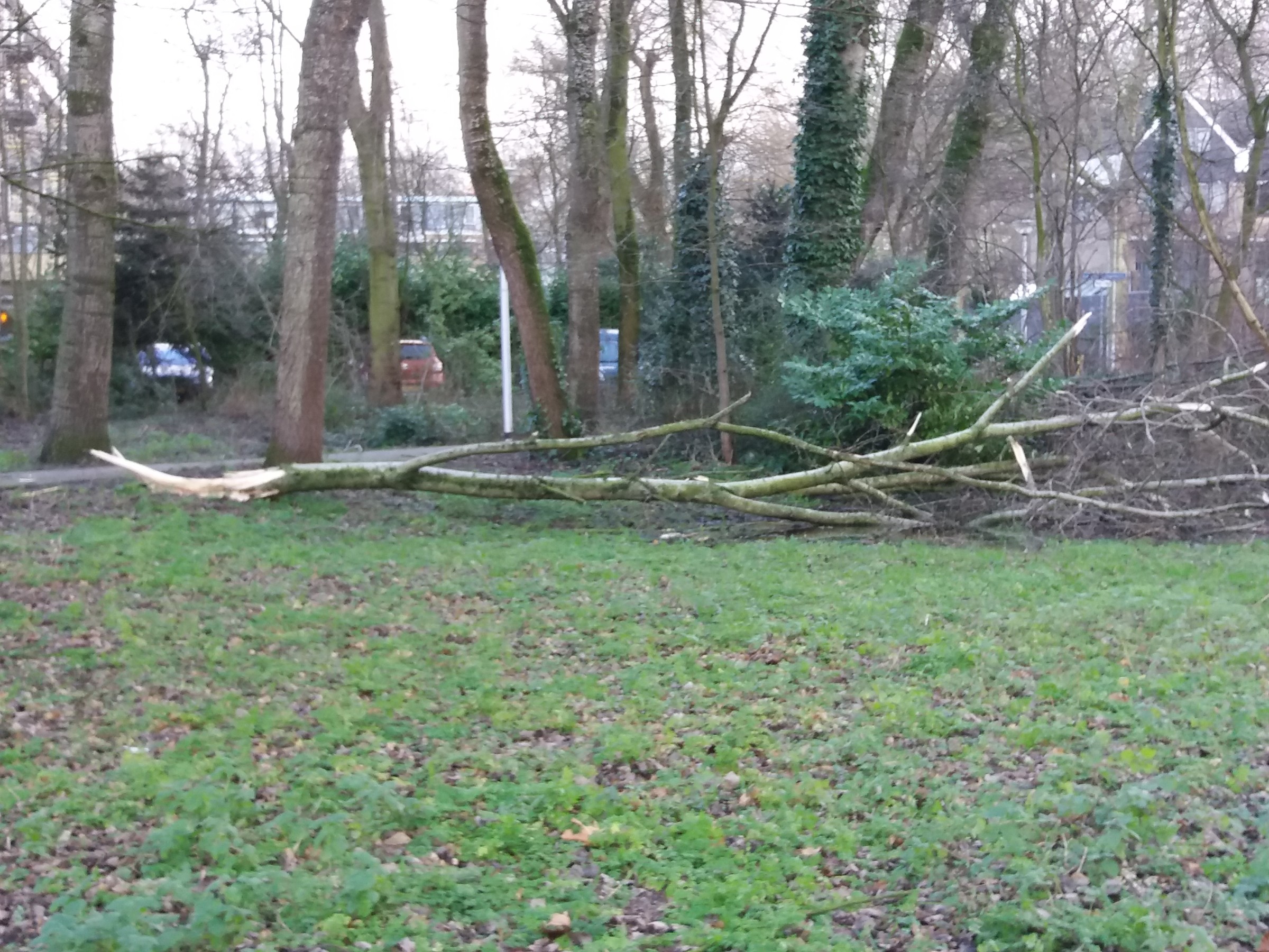 Vanmiddag mijn postrondje gelopen. Onderweg vooral veel afgeknakte bomen, een aanwijsbord voor een pinautomaat op de grond in plaats van aan de muur. Vanmorgen was het dak van het goudwisselkantoor afgewaaid, dus daarop waren vanmiddag mensen aan het werk. In onze eigen straat zijn enkele dakpannen gesneuveld, bij het huis dat de meeste harde windvlagen uit de polder opvangt. Blijkbaar was dit de bewoners nog niet eerder overkomen, ze wonen er minstens 25 jaar. Ook het dak van het bushokje is gesneuveld.