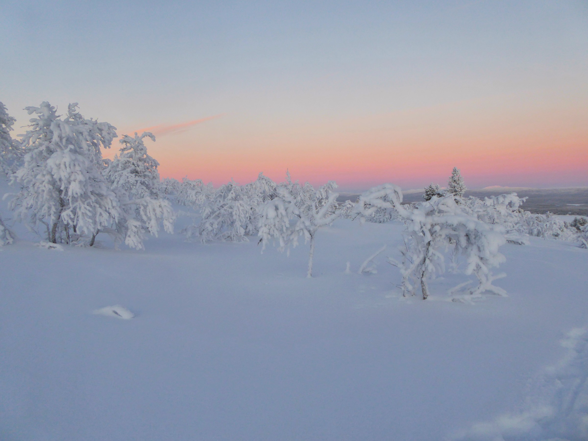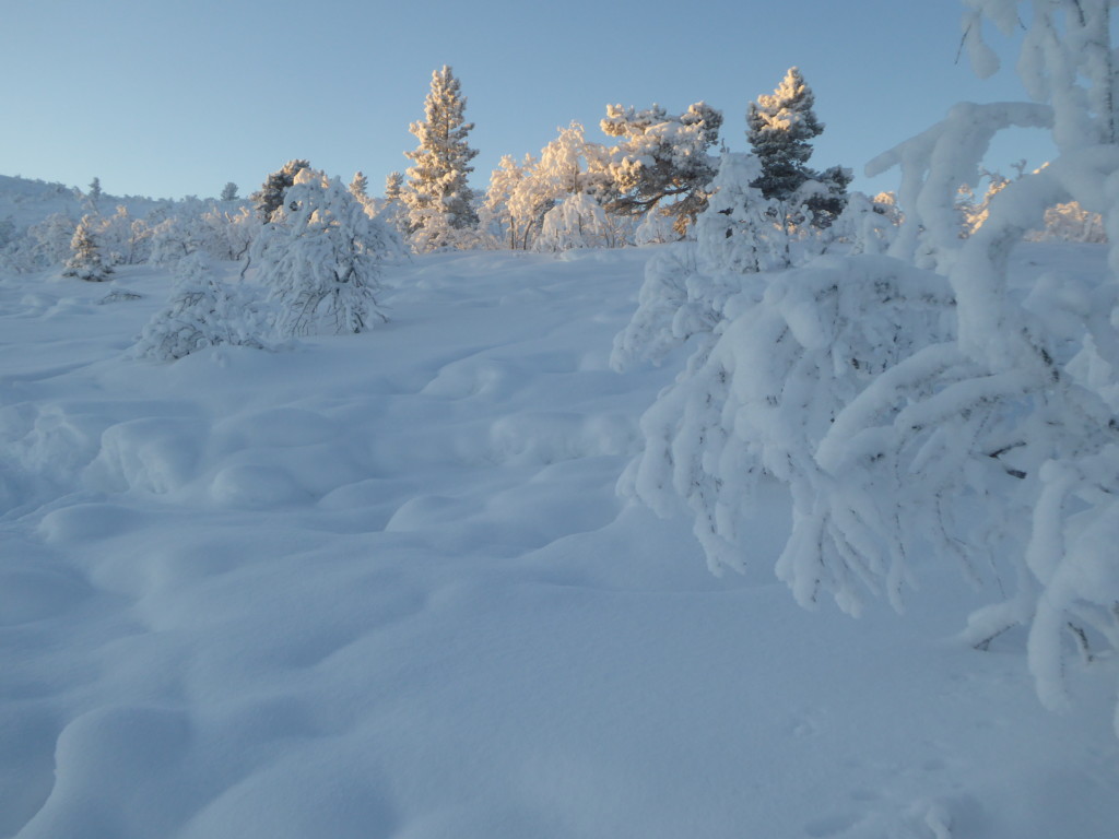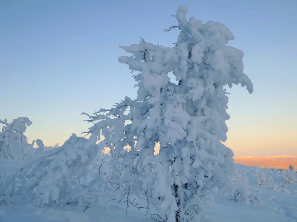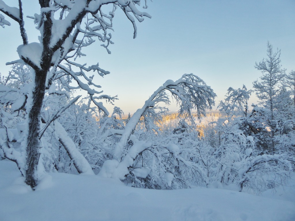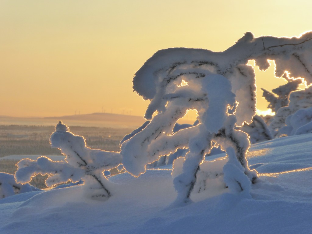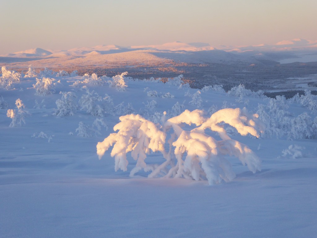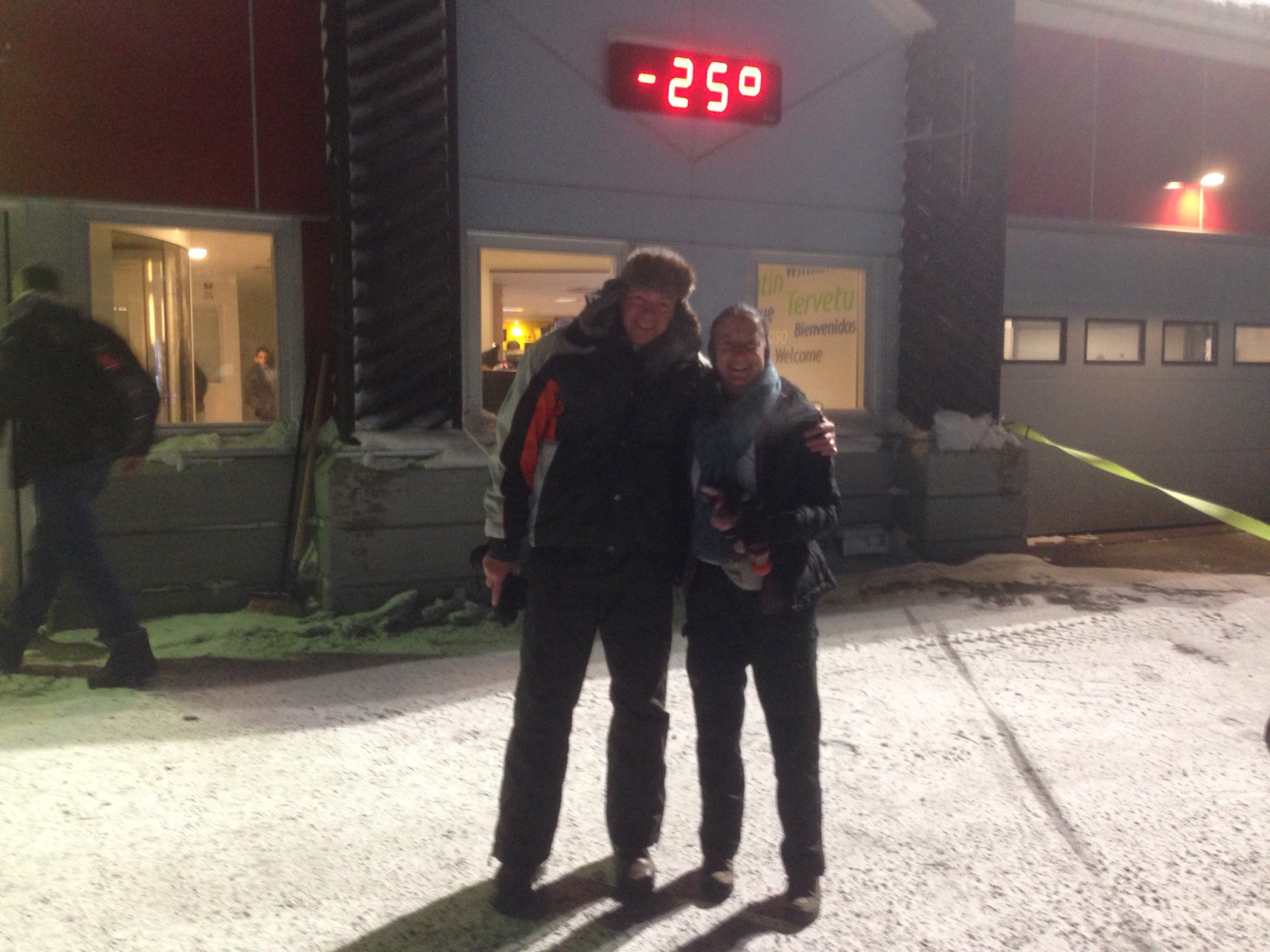 We kwamen aan vanuit Stockholm (glory kunnen spotten vanuit het vliegtuig) bij -25°, gelijk naar het ijshotel waar we een warme nacht en een koude nacht hadden geboekt. De koude nacht is slapen bij -5° in een kunstig gemaakte ijsgrot. 's Avonds werden we al getrakteerd op Noorderlicht, dat op- en afging. De volgende nacht vroor het -32° en gingen we sneeuwschoenwandelen de heuvel op: een heerlijke gewaarwording met bevriezende neushaartjes, wimpers en vingers bij het fotograferen.