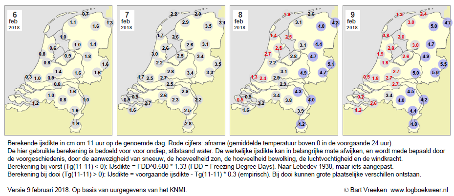 In het noorden van het land (o.a. Dannemeer) leek de berekening wel te kloppen. Waardoor dit verschil? De beste verklaring die ik kan bedenken zou wel eens de windkracht kunnen zijn. Op het Dannemeer, maar ook in de beroemde Ryptjerksterpolder, is die meer dan bij de beschutte vennen van Nijmegen. Kennelijk helpt dat om de stollingswarmte van het ijs af te voeren.