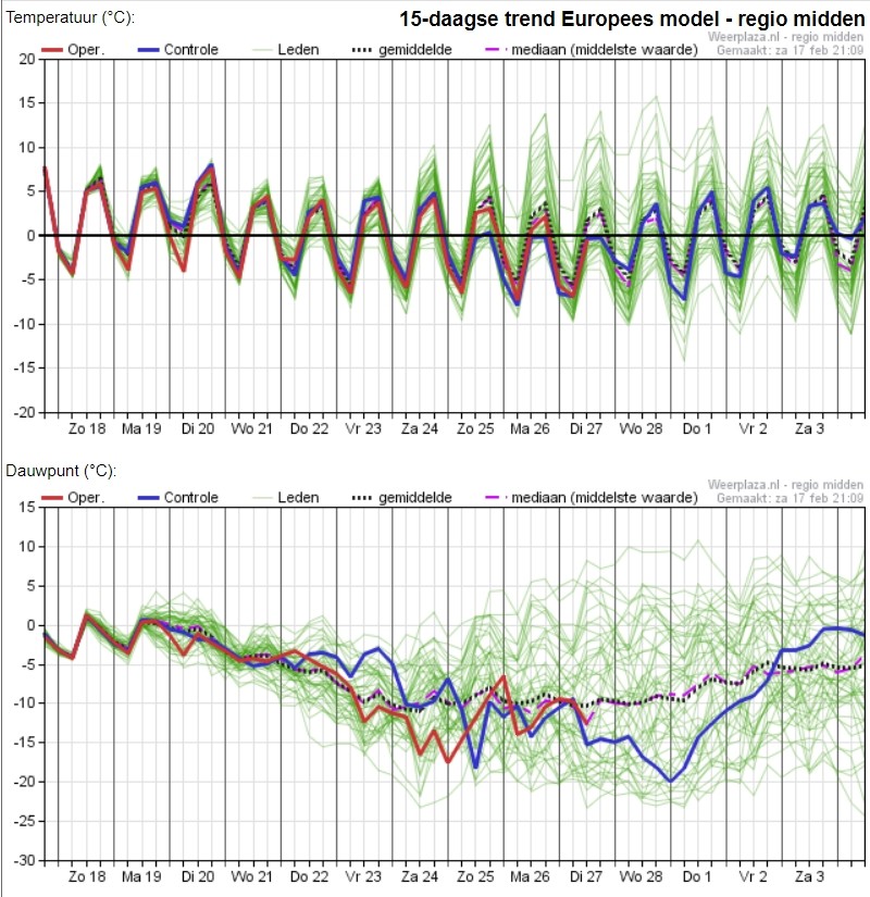 Vanaf dinsdag matige vorst met kans op langdurige verlenging. Zie eens die lage dauwpunten. Dat wordt snoepen!