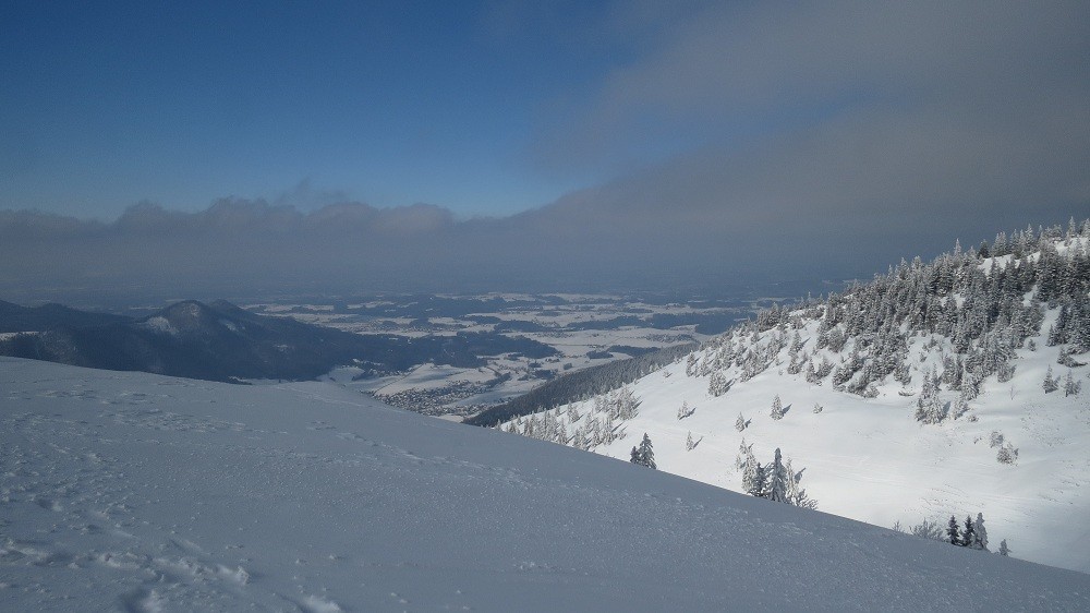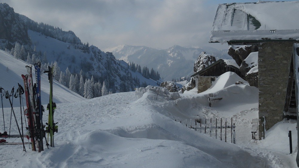Gisteren gingen we met de tourenski´s naar de Steinlingalm, onder de Kampenwand, boven de Chiemsee. In München was het -10°C, maar in Hohenaschau (uitgangspunt) slechts -9°C, en meer sneeuw dan in Waldperlach lag er ook niet (rond Rosenheim zelfs helemaal geen sneeuw, dus ook niet zo koud).