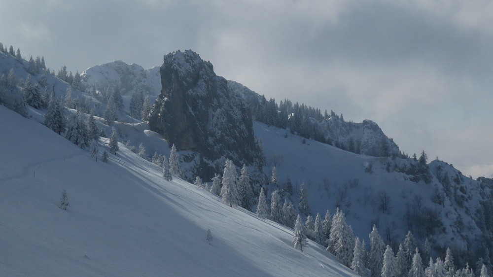 Het eerste stuk ging grotendeels door bos, dus in de luwte. Daardoor, en door de beweging, viel de kou reuze mee. Dat werd anders verder boven: het terrein werd open, daardoor kreeg de wind (minstens 4 bft) vat op ons, en kregen we het goed voor de kiezen. De accu van mijn fototoestel bedankte overigens voor de eer.