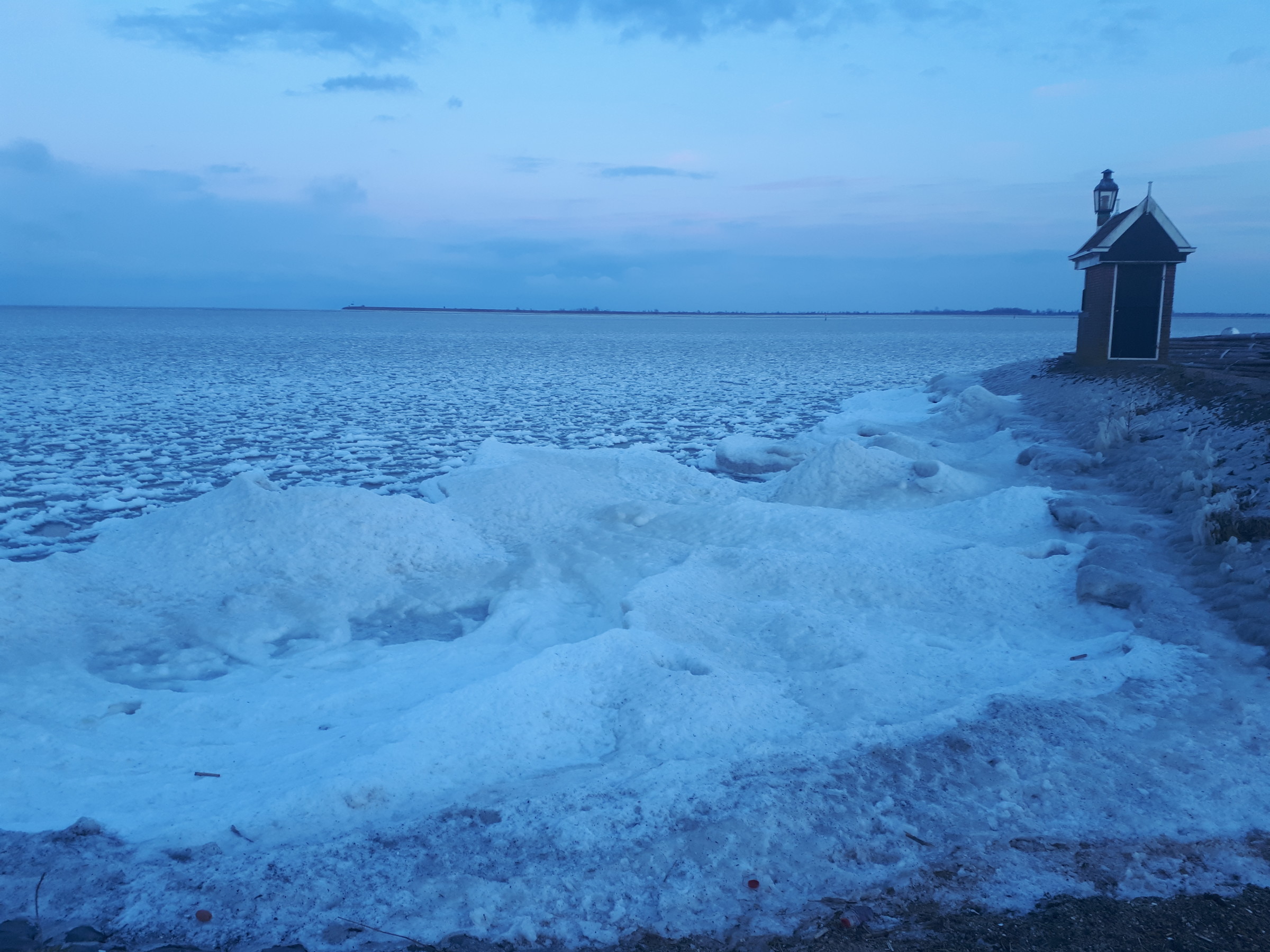 De Gouwzee ligt hier al helemaal dicht. De ijsdikte bedraagt ongeveer 1,5 cm. Helaas heeft de wind ook hier zijn werk gedaan en is het ijs al golvend bevroren. Hier valt absoluut niet op te schaatsen, maar een mooi gezicht geeft het wel.