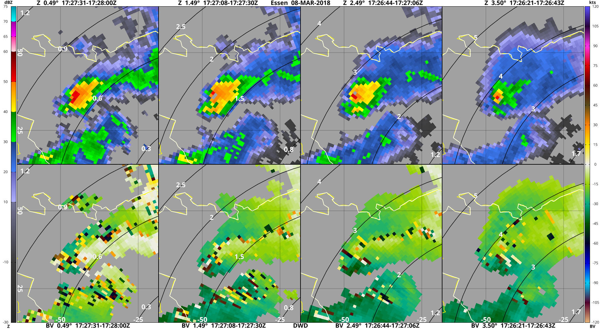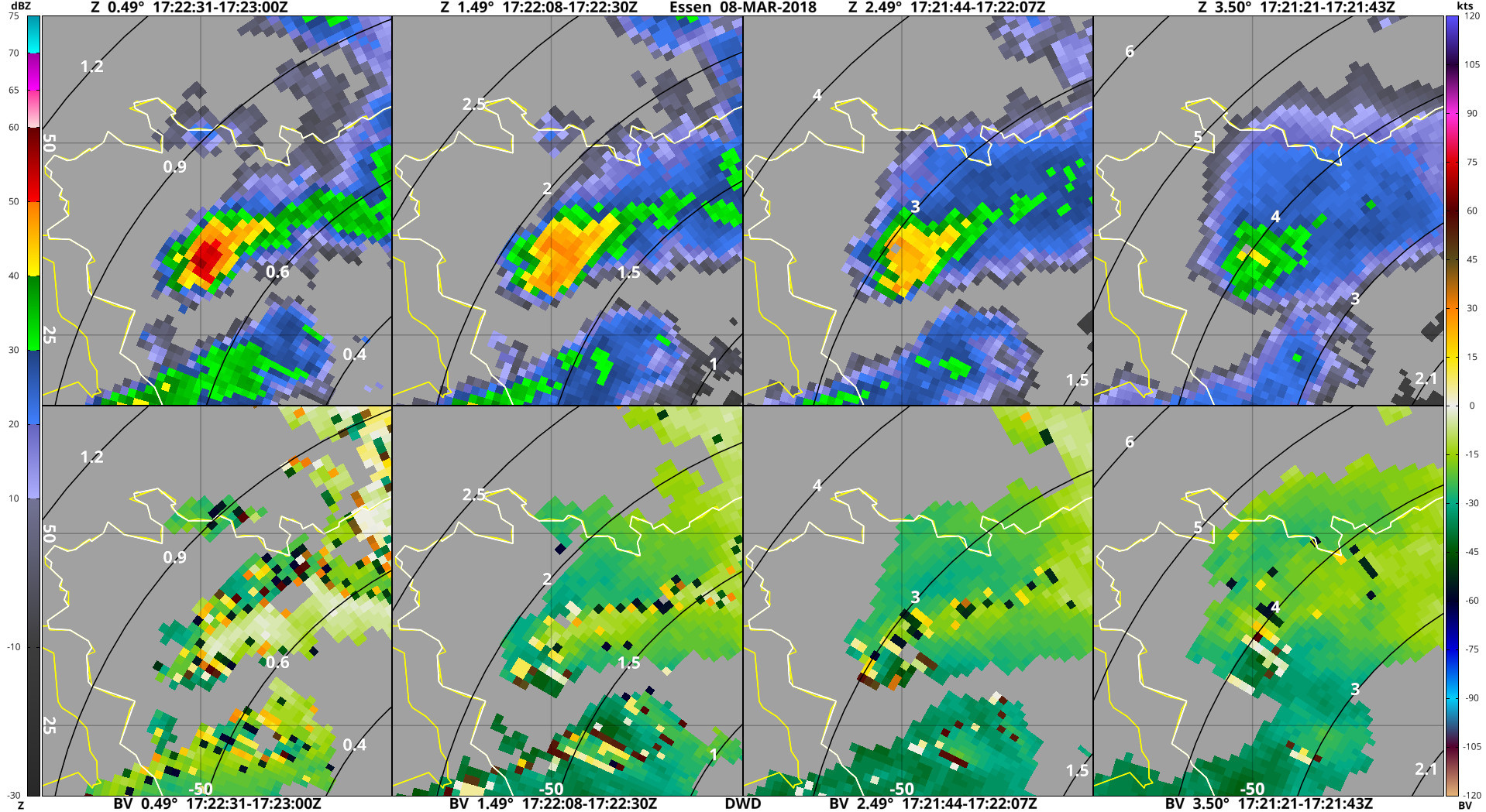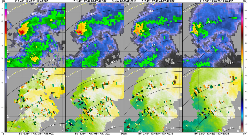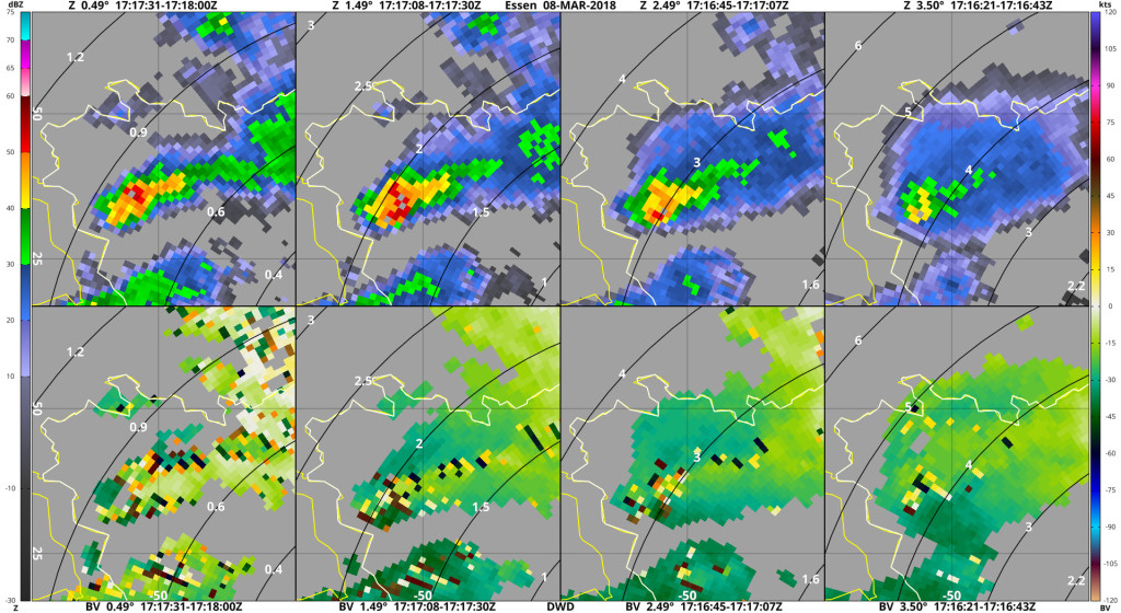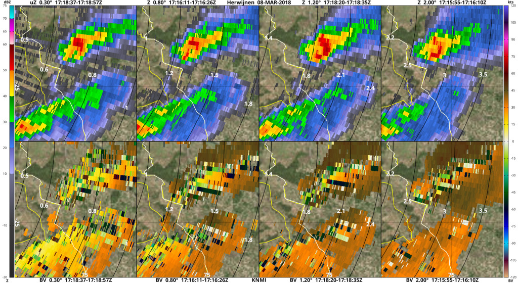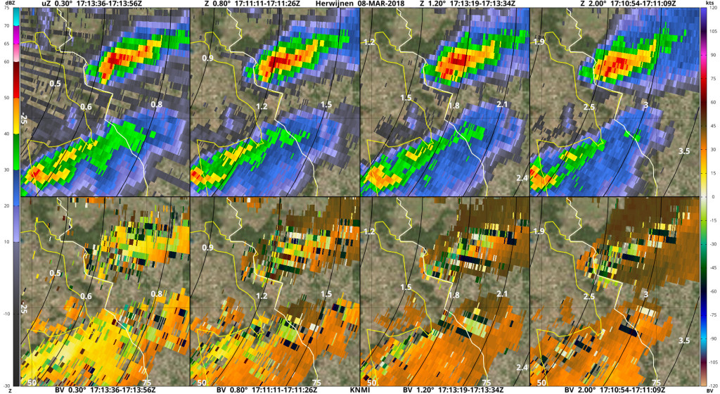 Hieronder radarbeelden van Herwijnen en Essen, die het idee geven dat deze cel een mesocycloon had.