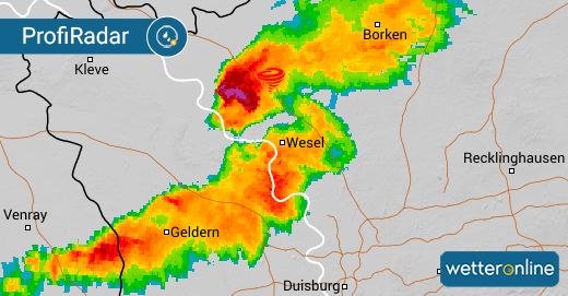 Dit radarbeeld van Wetteronline ziet er min of meer vergelijkbaar uit. Er wordt ook gesproken van een tornado, maar de verdere informatie maakt daarvan niet veel meer duidelijk.