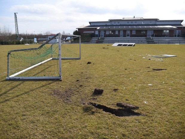 Dit artikel bevat 19 schadefoto's, en op sommige foto's is duidelijk te zien dat meerdere objecten over enige afstand door de lucht zijn verplaatst. De foto hieronder laat bijvoorbeeld een vermoedelijke inslaglocatievan het doel zien, en ook zie je enkele andere objecten midden in het veld liggen.