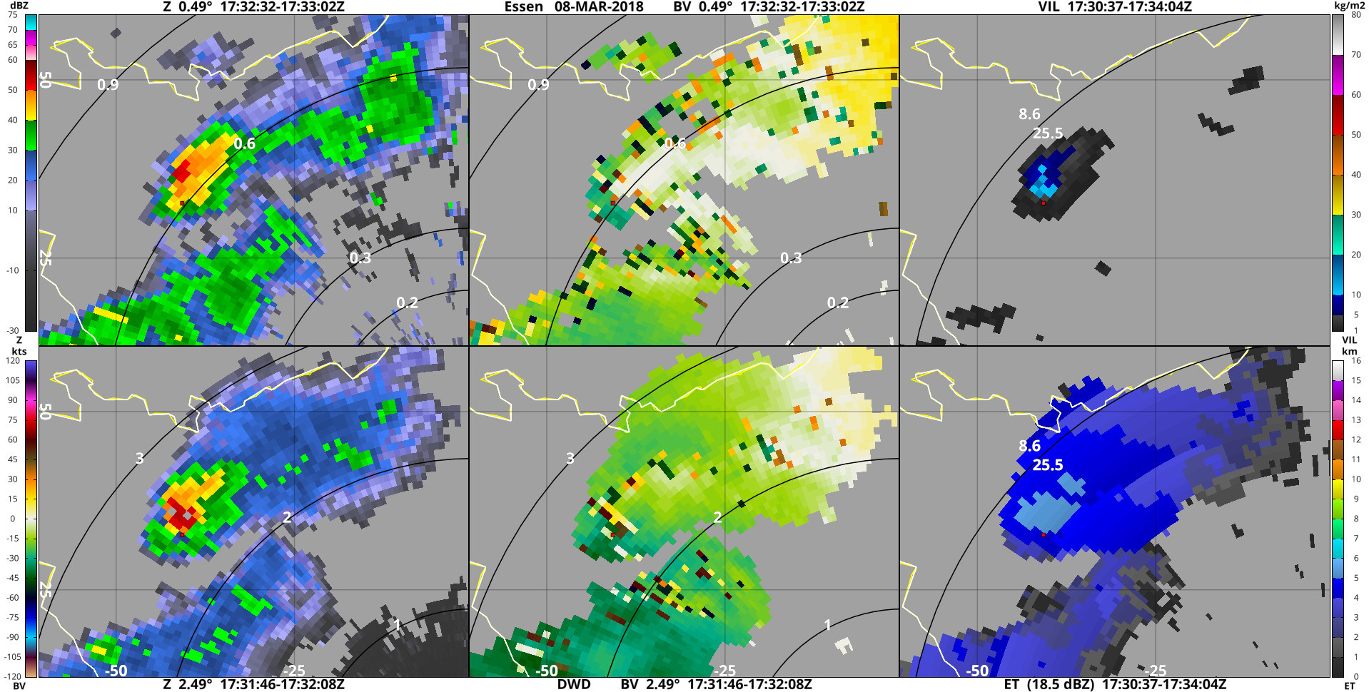 Toen die cel daar passeerde was hij zo'n beetje op zijn sterkst, voor wat betreft de reflectiviteit op verschillende hoogtes. Zie het radarbeeld hieronder.