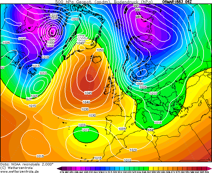 De geconstrueerde weerkaart van 6 maart om 6 uur 's morgens lijkt te bevestigen dat het hier niet om een polar low gaat, maar om een echte storm tussen een krachtige hogedrukgebied op de oceaan bij Ijsland en een randstoring boven de Oostzee.