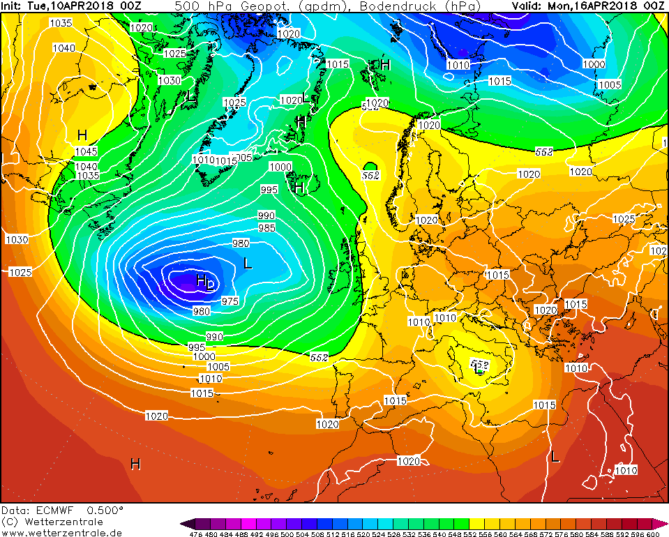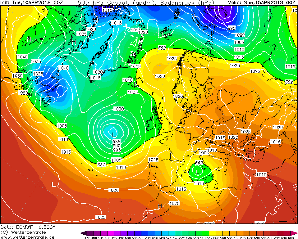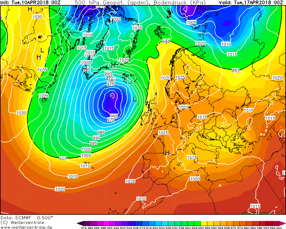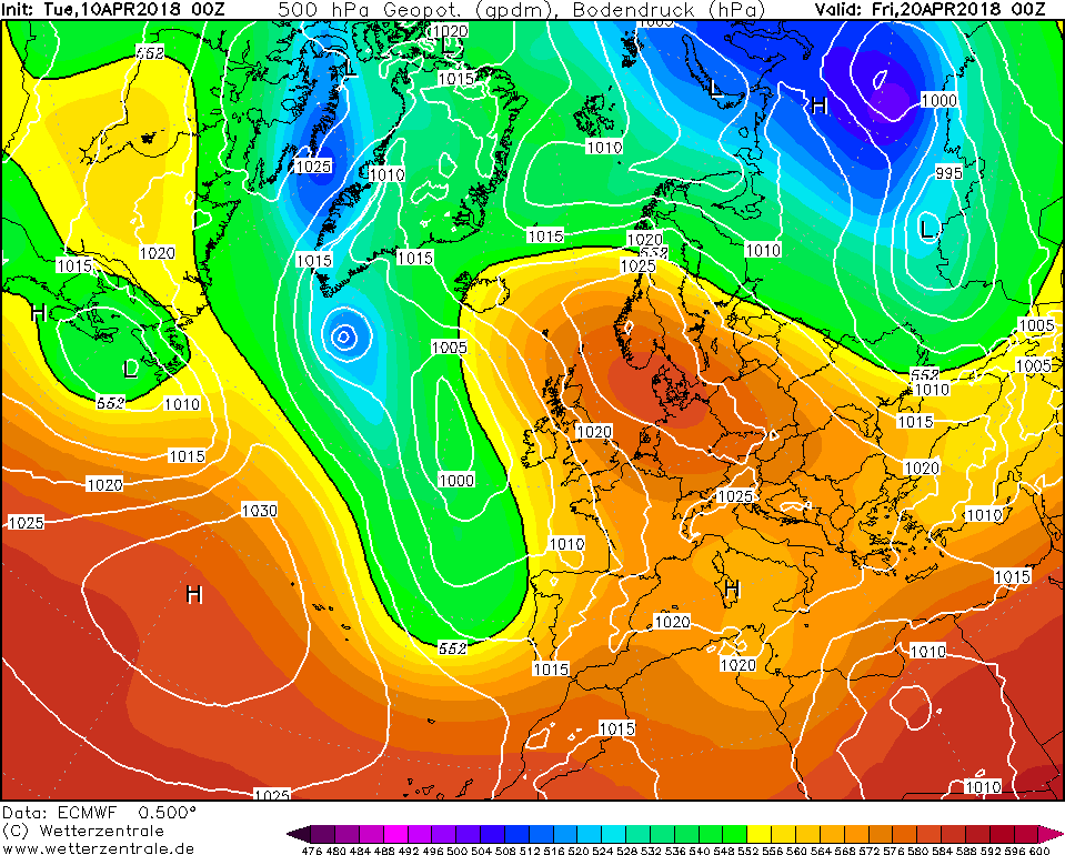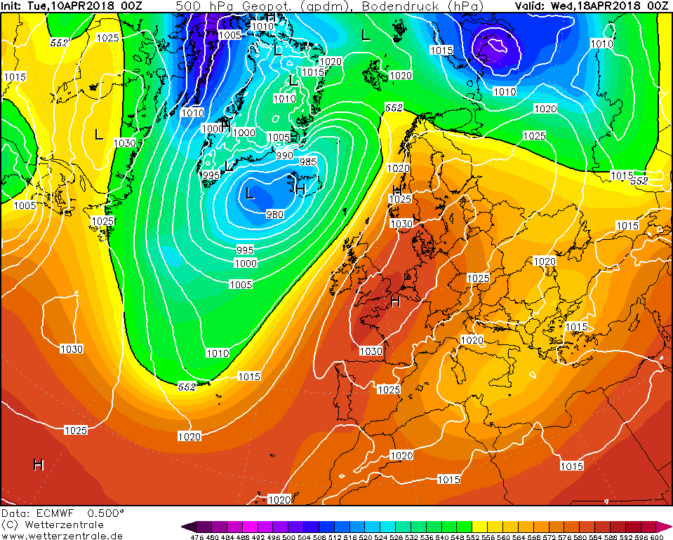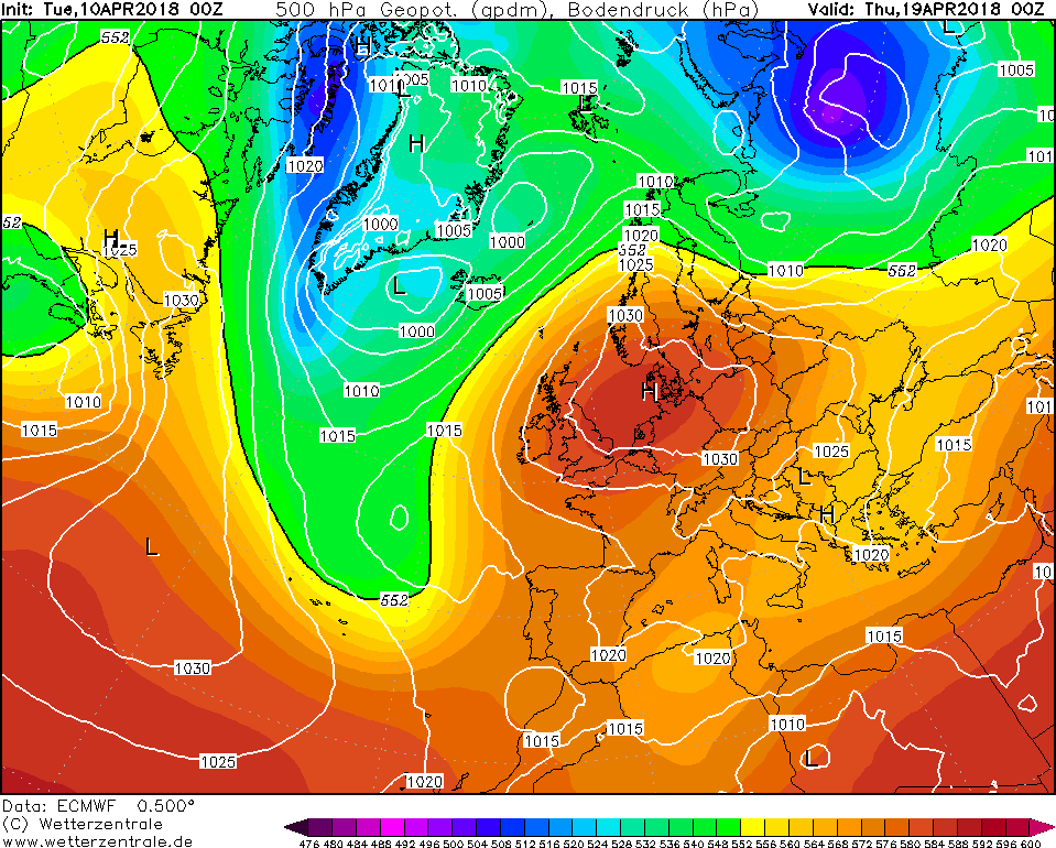 Gevoed door een omvangrijke depressie ten zuiden van IJsland ziet boven Spanje een omvangrijk hogedrukgebied het levenslicht. In andere gevallen zou een dergelijke depressie een WC kunnen aanjagen. Maar zover komt het in dit geval niet. Het is natuurlijk april en hogedrukgebieden krijgen steeds vaker de gelegenheid om zich ten koste van depressie te manifesteren. In dit geval is de depressie juist onze 'angel on our shoulder'. Vrijwel heel Europa komt in de lente er in, en hoe. Alleen delen van Griekenland,Italie en delen van de Balkan kans op buien in deze run. Maar die hoeven niet te klagen want die hebben sowieso een topzomer voor de boeg (standaard). Ik teken voor deze Oper, meteen.