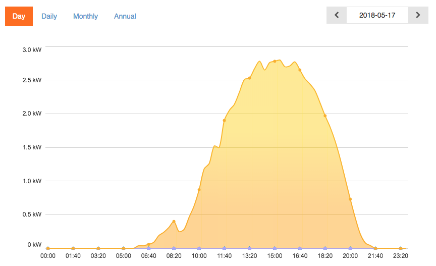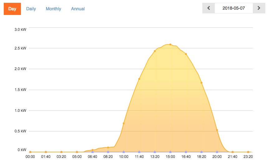 Ondanks dat de lucht niet perfect blauw was produceerden mijn zonnepanelen gisteren meer energie dan ooit. Ik heb ze sinds vorig jaar maart maar nog nooit had ik dit rendement. Ook niet tijdens de onbewolkte dagen eerder deze maand. Daaraan zie je dat de warmte toch flink nadelige invloed heeft. Vergelijk hieronder 17 mei met 7 mei. Hoe warmer het werd tussen 5 en 8 mei hoe minder opbrengst ik had.
