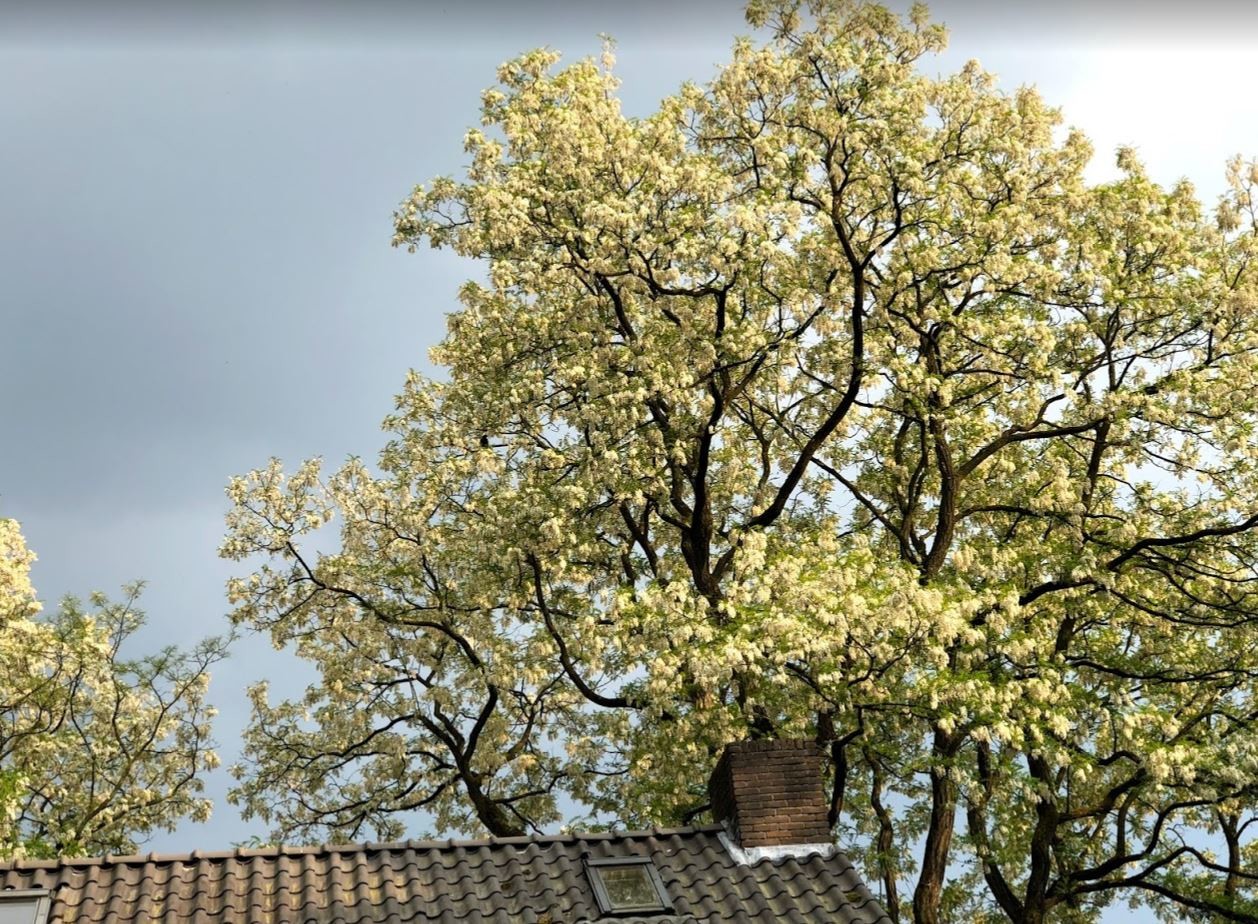 Een foto van voor de bui. Ongekend veel bloesem in de bomen in de tuin. (Acacia's)