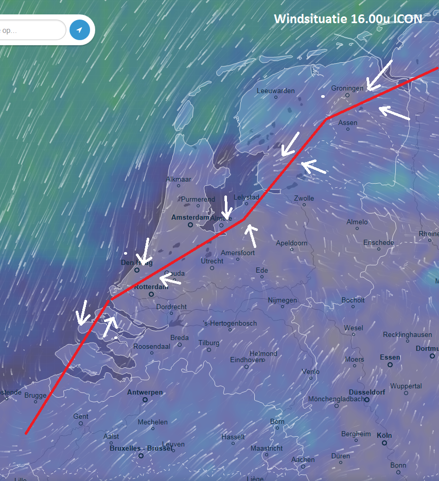 Ik vind het altijd interessant om via de Ventusky-app te kijken waar vanmiddag de extra forcering, in de vorm van convergentie, plaats zou kunnen vinden. Nu weet ik dat er meerdere factoren de buienmotor op gang kunnen brengen. Ten zuiden zit je gebakken. Maar convergentie blijkt vaak een belangrijke factor. Volgens het gebruikte model, ICON, moet dat rond onderstaande gebieden zijn. De laatste keren klopte het aardig. Vanmiddag een mooie nieuwe test. Al hoop ik op 100 kilometer noordelijker. De noordooster blaast hier stevig door en houdt het kwik nog aardig in bedwang en en passant ook de buienmotor.