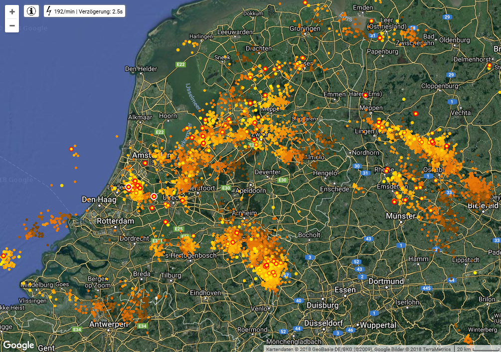De zuidelijke bui (ten opzichte van Doetinchem) breidt langzaam zuidwestelijk uit, de noordelijke bui (noord-)westwaarts. Dit is ook te zien aan de hand van de bliksemontladingen. Daartussen vindt dus wat uitstroming (divergentie) plaats. Dit is dus echt zo en moet toch eens nader onderzocht worden. Overigens gaat het om een streek die wat groter is en zo'n beetje oostelijk of midden Gelderland beslaat.