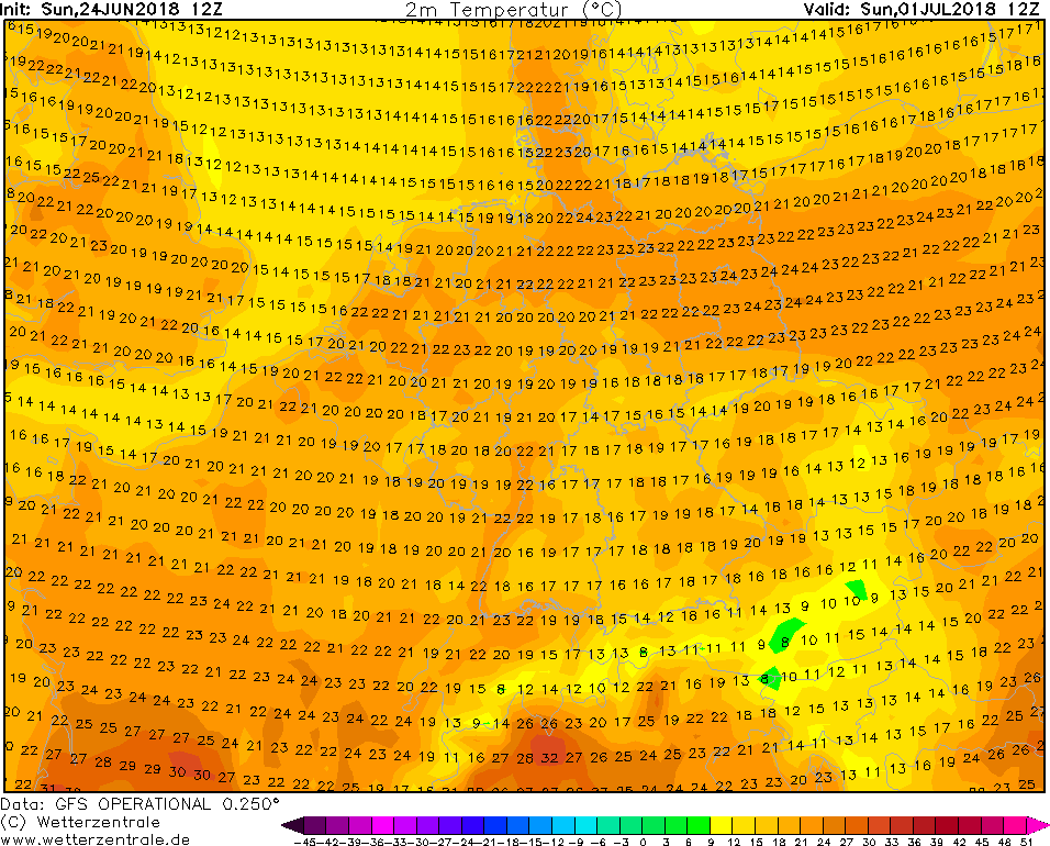 op zondag aldus GFS. Stroming is anticyclonaal, enkel op zaterdag een graadje koeler, in het NO van de Benelux nog wat koelerdoor de bewolking.