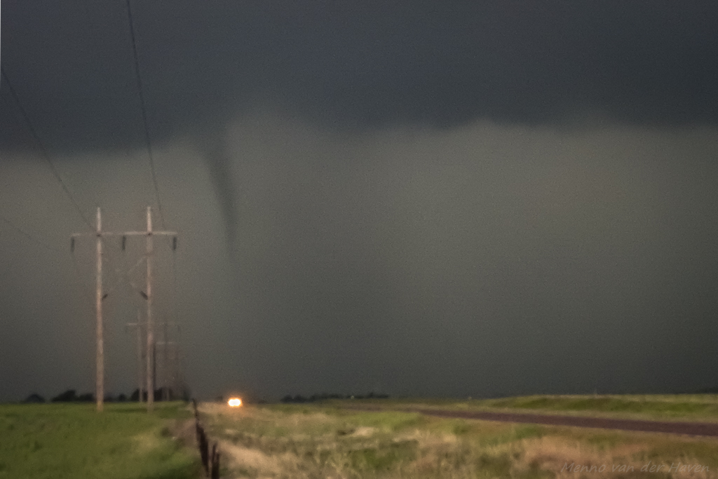 Meer dan 10 minuten konden we van deze windhozen genieten, voordat de outflow van de naderende supercell hen de das om deed. Het begon te regenen en een erg groene lucht naderde vanuit het westen: tijd om ons te verplaatsen. Een kwartier later hadden we zicht op een wallcloud, deels 'rainwrapped', waarbij zich even later weer een slurf vertoonde. Deze trok zo'n mijl van ons vandaan in zuidoostelijke richting en was een halve minuut aan de grond: tornado dus !