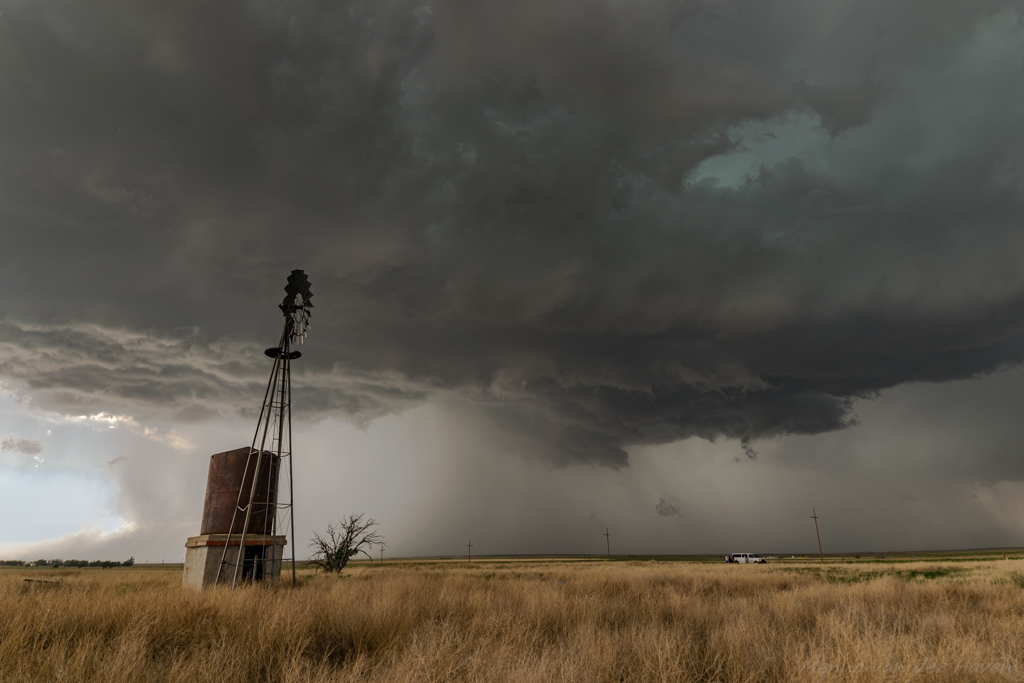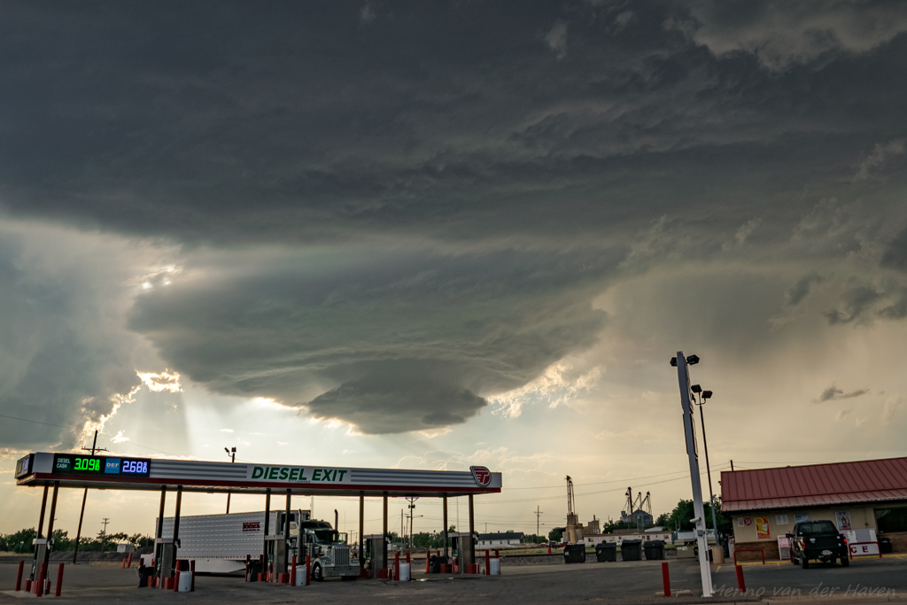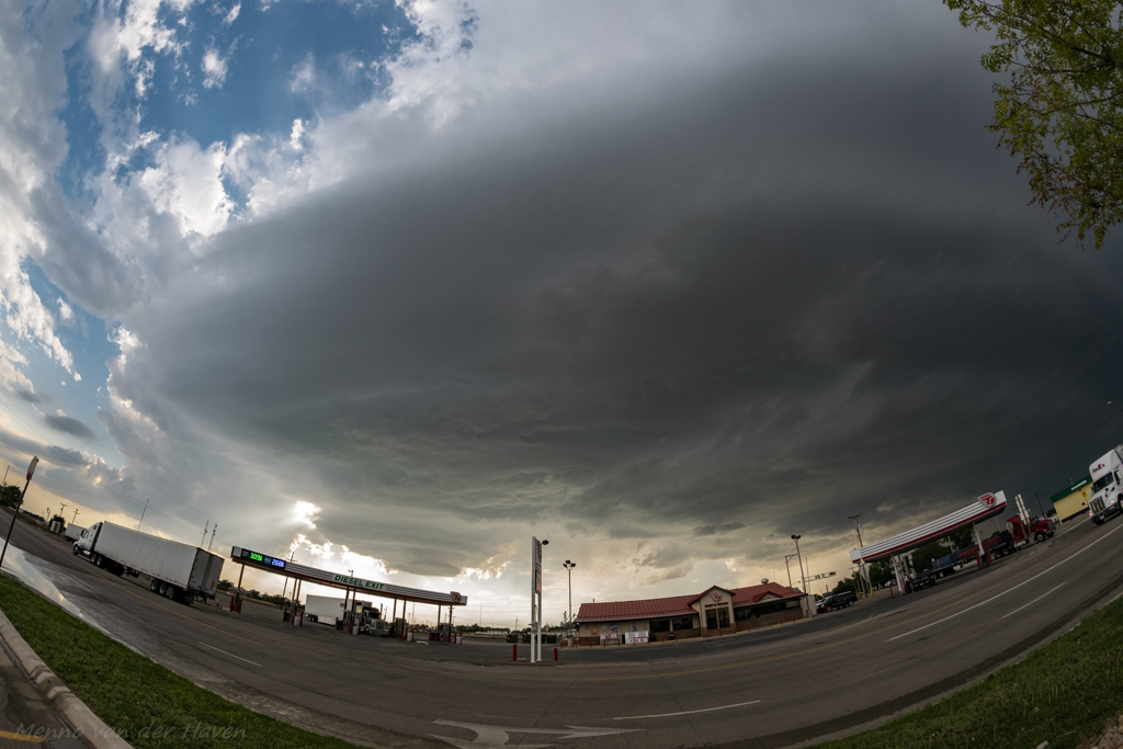 Soms is het de moeite waard om juist iets van de bui vandaan te zitten om mooie dingen te zien. Voor een tankstop moesten we een paar mijl naar het zuiden afbuigen, vanwaar we in Stratford, TX een mooi zicht op de supercell hadden. Alleen met een 8 mm lens (12mm cropsensor) kon ik de hele meso in het vizier krijgen: