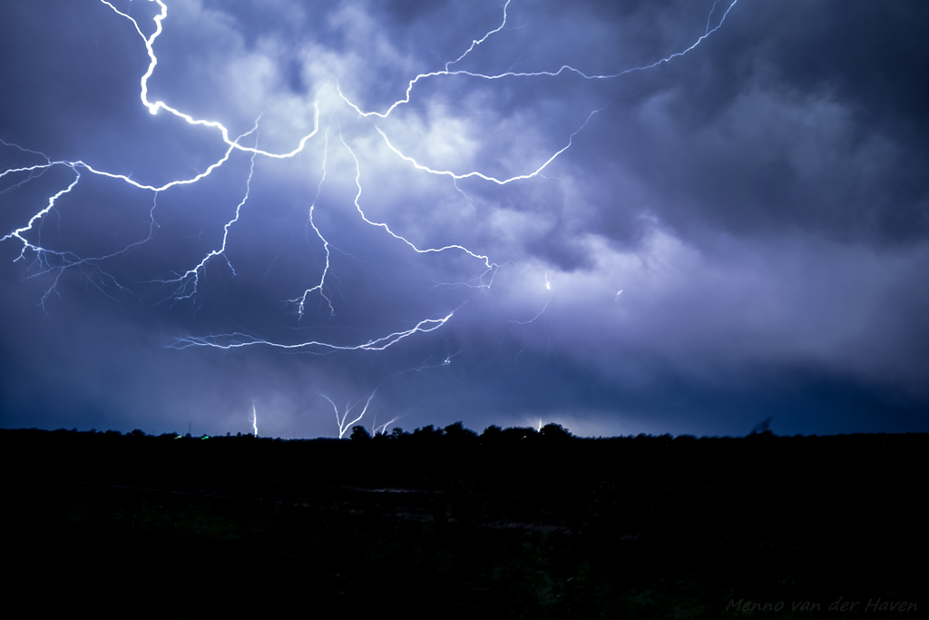 Tijdens het fotograferen ondervonden we ook nog een paar keer een 'heatburst': de wind wakkerde sterk aan (tot 7 á 8 Bft) en de temperatuur steeg zeer snel van 20C naar iets van 30C om na een 1-2 minuten weer af te nemen. Door de sterke wind was het lastig om je statief stil te houden, de derde bliksemfoto is dan ook enigszins bewogen.....