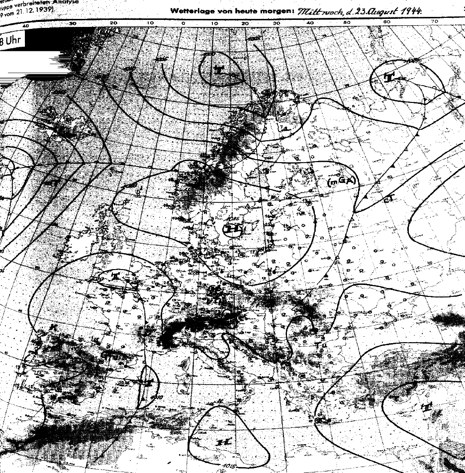Ik heb vandaag meer gescande waarnemingen van de Duitse maritieme weerdienst uit de oorlogsjaren gevonden en bekeken. Voor 23 augustus 1944 zijn gedetailleerde sondeoplatingen, elke 6 tot 12 uur, en ook grondwaarnemingen uit heel Duitsland en de bezette landen eromheen.