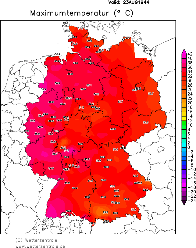 Bijgaand nog een overzicht van alle Duitse stations op die datum en die waarde van 38.4 gr. C net over de grens.