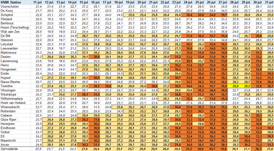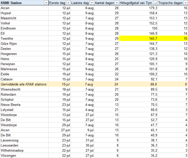 Het overzicht spreekt voor zich, we hebben een bijzondere periode achter de rug. Maarliefst 14 KNMI stations hebben het oude duurrecord van Arcen verbroken en Eelde evenaarde dit record met 22 dagen. Verder is de gemiddelde maximumtemperatuur over alle KNMI stations (dus niet alleen de stations met een hittegolf) 24 dagen op rij zomers geweest en daarbinnen op 8 dagen zelfs tropisch. Het hittegolfgetal van Tijm en het aantal tropische dagen op Twenthe zijn nog onder voorbehoud, omdat daar de maxima van 28 en 29 juli nog niet bekend zijn. Deze heb ik op basis van Hupsel, Heino en Nieuw Beerta conservatief ingeschat ten behoeve van dit overzicht. Tot slot is in het eerste overzicht de ranglijst gesorteerd op het hittegolfgetal van Tijm.