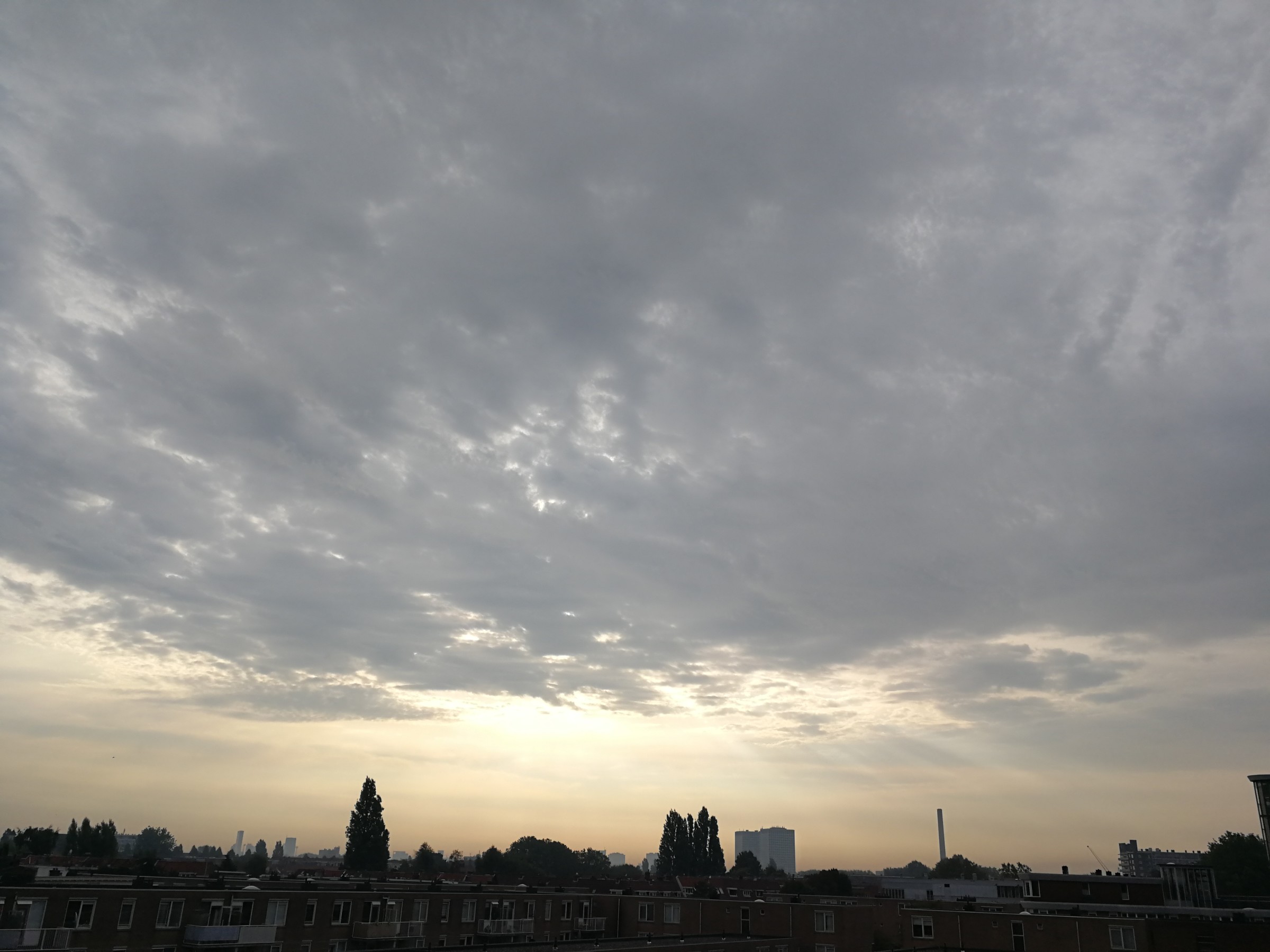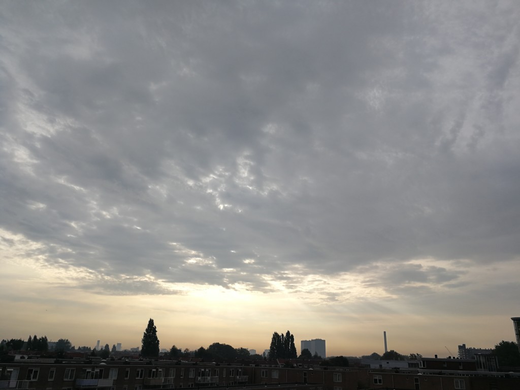 Op mijn werk in Rotterdam Oude Westen 46 druppels per vierkante meter gevallen, nu altostratus waardoor de zon als een lichtvlek zichtbaar is, nu voelt het wat zachter aan buiten.
