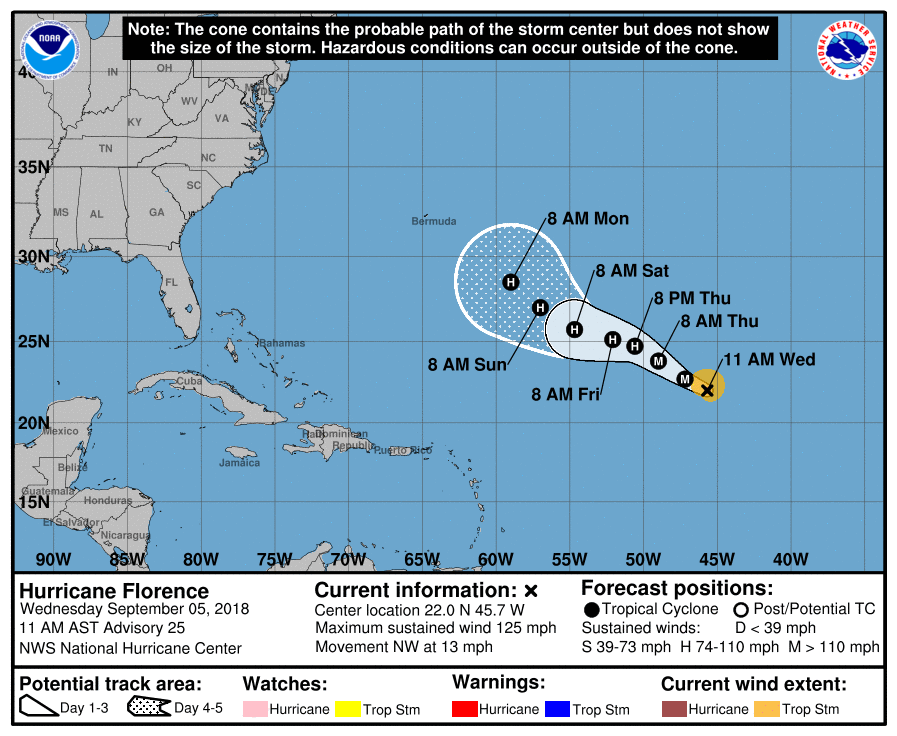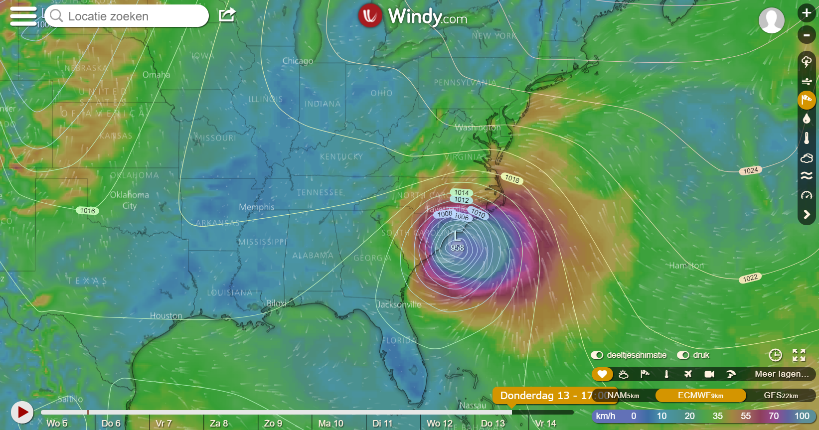 Florence is op dit moment een krachtige categorie 3 orkaan op de Atlantische Oceaan en daarmee de eerste 'major hurricane' op de Atlantische Oceaan van 2018. Florence is een stuk krachtiger geworden dan gedacht werd. Origineel werd slechts tropische storm kracht of categorie 1 verwacht. Hoewel de meerderheid van de modellen Florence nog steeds duidelijk weg van de kust van de VS houden, is het verwachte pad wel meer ten Westen komen te liggen. Opvallend is dat de 2 grote modellen, EC & GFS, de storm in hun opers wel richting de VS sturen. Bij GFS gaat de storm langs de kust, maar EC heeft een echte landfall als een sterke orkaan. EC laat dit patroon ook al in de vorige run zien. Ik heb de plaatjes hieronder bijgevoegd, maar het is allemaal nog te vroeg om ergens zeker van te kunnen zijn.