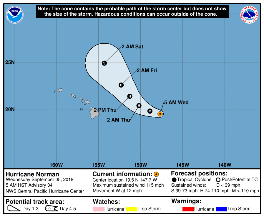 Norman ligt op dit moment dichtbij Hawaii als een cat 3, maar er wordt binnenkort een beweging richting het Noorden verwacht. Er is een kleine kans (10 - 20%) op tropische storm toestanden op de meest Oostelijke eilanden, maar zeer waarschijnlijk zal Norman de eilanden helemaal sparen.