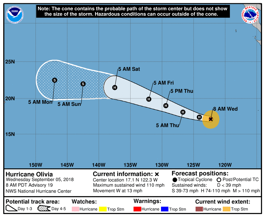 Olivia is momenteel een krachtige categorie 2 orkaan op de Pacifische Oceaan. Er is een kans dat Olivia een gevaar kan vormen voor Hawaii, maar dat ligt nog vrij ver in de toekomst en bovendien wordt verwacht dat de storm de komende tijd in kracht zal afnemen.