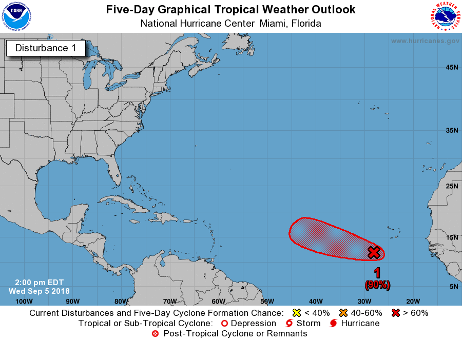Ten Westen van Afrika ligt een disturbance met een 90% vormingskans over de komende 5 dagen. We kunnen er dus vrij zeker vanuit gaan dat dit deze week een nieuwe tropische storm gaat worden.