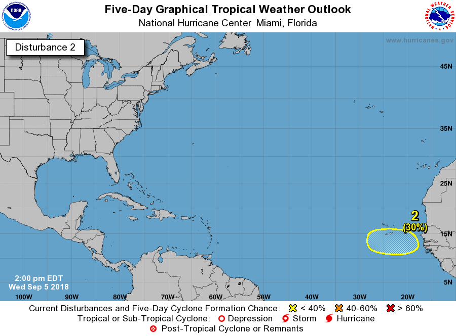 Iets meer ten Oosten van van de 1e disturbance ligt nog een disturbance. Die heeft een kleinere vormingskans, 30% over de komende 5 dagen.