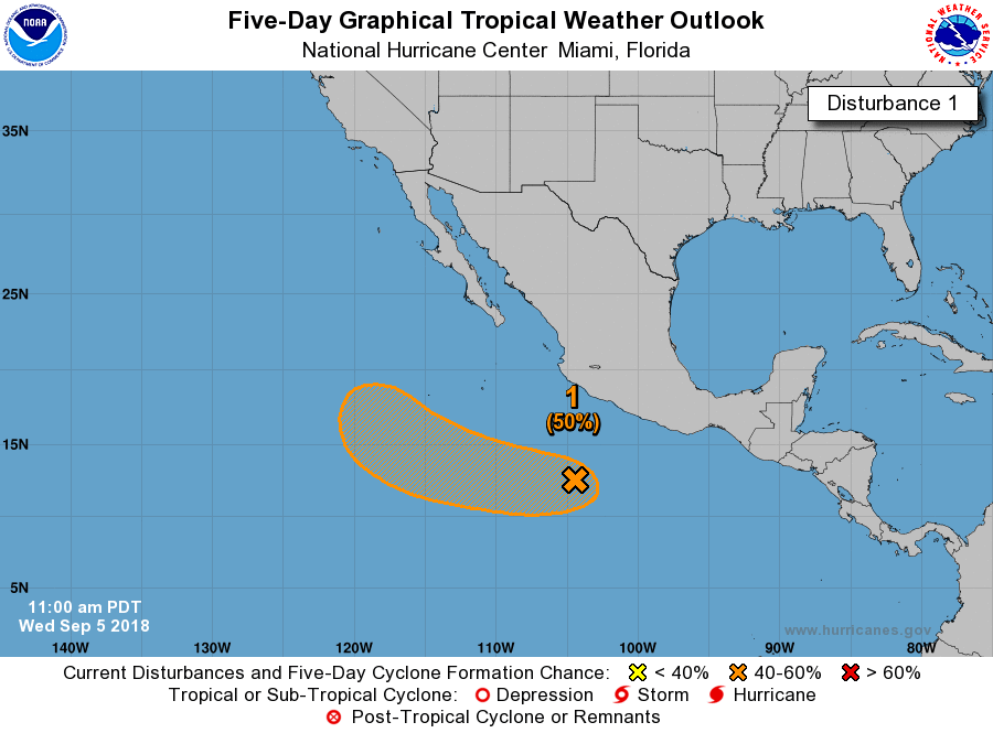 Als afsluiting van dit overzicht is er ook een disturbance in de Pacifische Oceaan. Vormingskans over de komende 5 dagen is 50%.