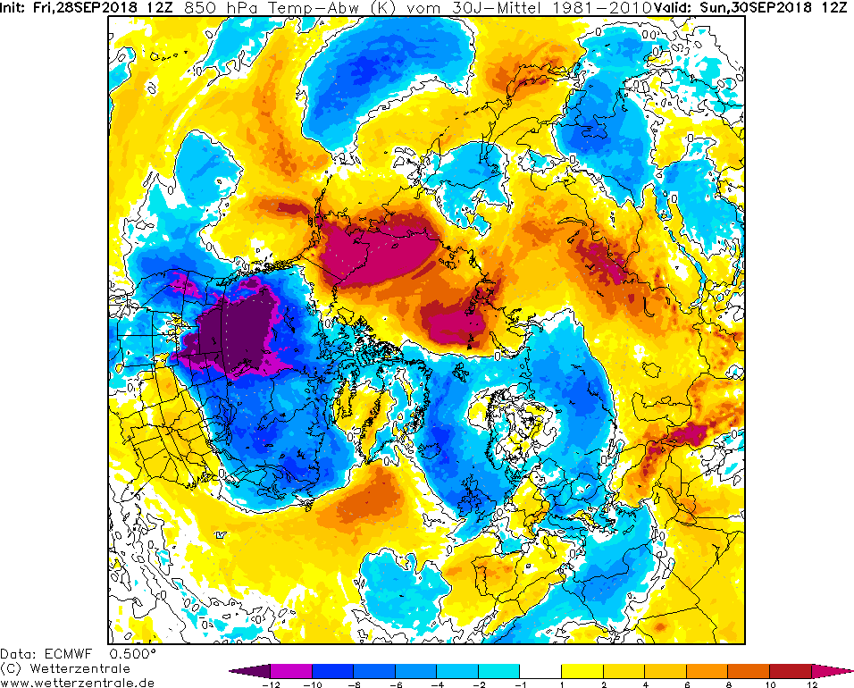 Komt de komende dagen nog wat noordelijker te liggen, waardoor het midden/westen van Canada met flink negatieve afwijkingen te maken heeft.