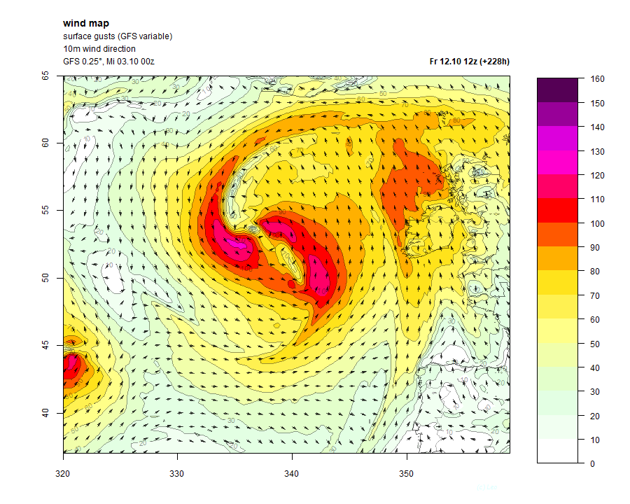 According to GFS Leslie is going to pull east, crossing Azores, almost keeping its strength until it is turning northward. It could then even pass Norway to the north and vanish somewhere in the arctic ocean)