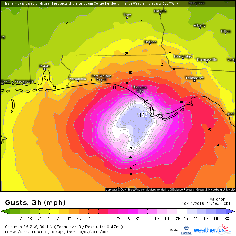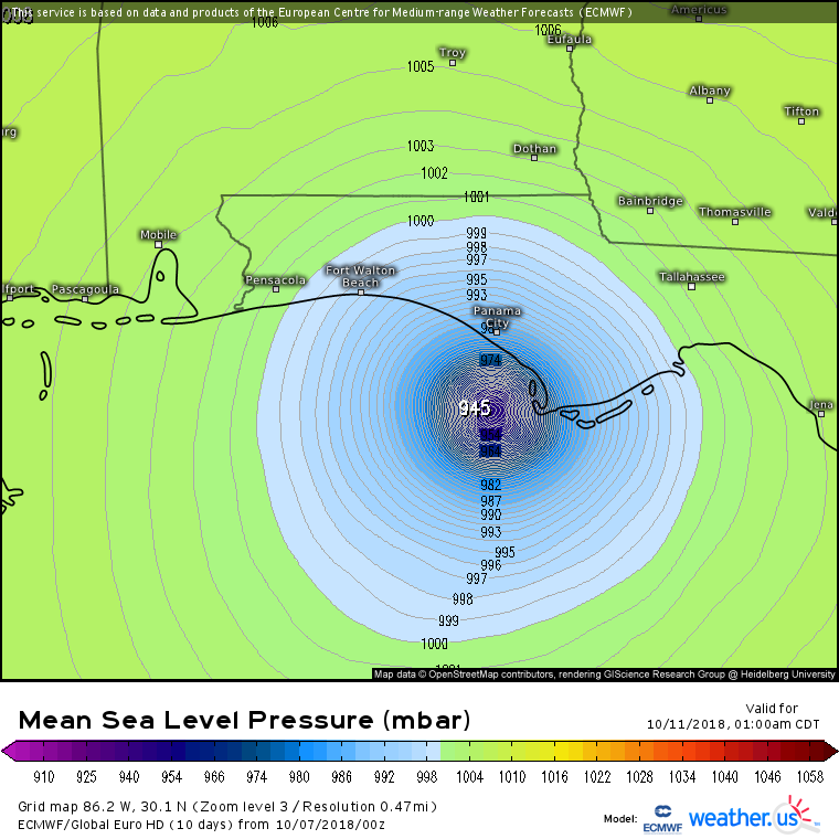 Hieronder de kerndruk van de orkaan bij landfall volgens de 06z runs van de modellen. In ongeveer 3 uur komen de 12z runs binnen en zullen we merken hoe consistent de runs zijn. Voor het gewone publiek zijn de EC runs niet beschikbaar, maar via een ander forum heb ik de onderstaande afbeelding van de EC run kunnen krijgen die dus voor een kerndruk onder de 950 hPa gaat.
