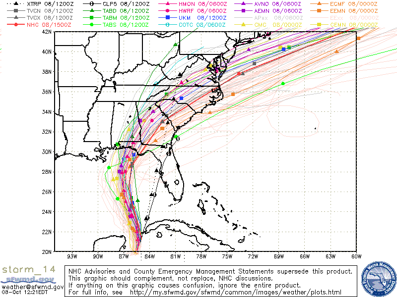 Opvallend is dat vrijwel alle modellen nu gaan voor een landfall bij 960 hPa of lager. Gisteren rond deze tijd zat ECMWF nog op 945 hPa, nu is hij alweer 11 hPa gedaald. Het gevaarlijke is dat de locatie en het tijdstip van de landfall nog erg onzeker zijn. Er is een significant aantal modellen waarbij er leden zijn die met een scherpe draai naar het Oosten komen, waardoor een groter deel van Florida in gevaar zou zijn. Erg opvallend is dat erg veel leden van de huidige modellen op dit moment (dus t = 0 uur) al te ver naar het Westen zitten in vergelijking met de werkelijkheid. Op de orkaanforums wordt gesproken over 'Western errors' die ook voorkwamen bij andere orkanen die plots naar het Oosten gingen. Maar ook een pad ten Westen van de huidige Nhc lijn is nog te zien in sommige leden. Het enge is dat de modellen onderling nog veel verschillen in de 12z runs. Een groep modellen moet dus verkeerd zitten, maar welke dat gaan worden is nog onduidelijk en kan mogelijk pas morgen, 24 uur voor landfall, duidelijker worden.