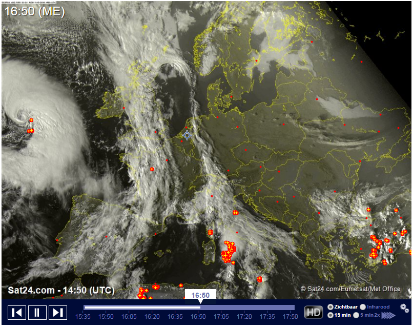 Invallende duisternis en vrijwel wolkenloos in het hogedrukgebied ten oosten en aanstormend geweld in het westen. In het midden zitten wij precies tussen de opklaringen heerlijk in de zon.