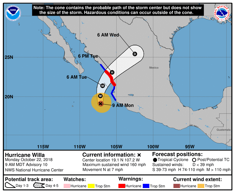 Waar velen gisteren al bang voor waren is gebeurd. De zeer snelle intensificatie van Willa is sinds gisteren niet gestopt en kort geleden heeft Willa categorie 5 bereikt. Willa is de 3e cat 5 orkaan in de Oost-Pacifische Oceaan dit seizoen. Het is de 1e keer sinds 2002 dat er in deze oceaan 3 cat 5 orkanen zijn in één seizoen. Het is ook de 10e major hurricane van het seizoen en ook de 10e orkaan die minstens een cat 4 is. Hiermee is dit ook het seizoen met de meeste cat 4 of 5 orkanen. Het oude record stond op 'slechts' 7 uit 2015. En het record van meest actieve seizoen ooit lijkt flink verbeterd te gaan worden. De ACE ligt nu al op 305 tov van 295 gisteren. Dat record van 295 uit 1992 wordt flink verbeterd. Nu nog even van informatie over Willa zelf. Verwacht wordt dat Willa nu of snel een Eyewall Replacement zal ondergaan, waarbij de kracht van de orkaan afneemt. Na de Eyewall Replacement sterkt de orkaan normaal gesproken juist weer aan, maar op dat moment zal Willa misschien al bijna op land zijn of al zijn aangekomen. Daarom is de kans groot dat Willa op dit moment haar piekmoment beleeft. Ik heb echter ook sommige berichten gelezen van mensen die beweren dat de ERC van Willa zeer kort is en al bijna klaar is. In dat geval is verdere aansterking nog mogelijk. Aankomst in Mexico wordt morgenavond plaatselijke tijd verwacht als een major hurricane.
