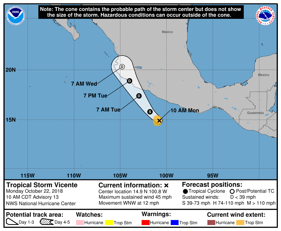 Onder Willa bevindt zich tropische storm Vincente. Door de nabijheid van Willa lijkt er niet veel kans te zijn voor Vincente om zich goed te ontwikkelen. Verwacht wordt dat de storm dinsdagavond plaatselijke tijd als een tropische depressie aankomt in Mexico.